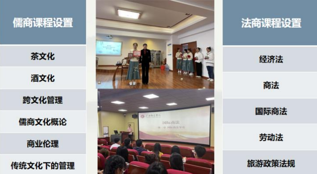 以学科交叉融合思路,聚力拓宽课程体系中内涵宽度,注重实现人才培养对接社会发展需求的目标,不断调整和优化课程设置,按照应用型课程迭代升级思路,构筑了蕴含法律和儒商内容的课程体系。课程中特别设置了经济法、国际商法等法律相关课程,以及茶文化、儒商文化概论等儒商相关课程。