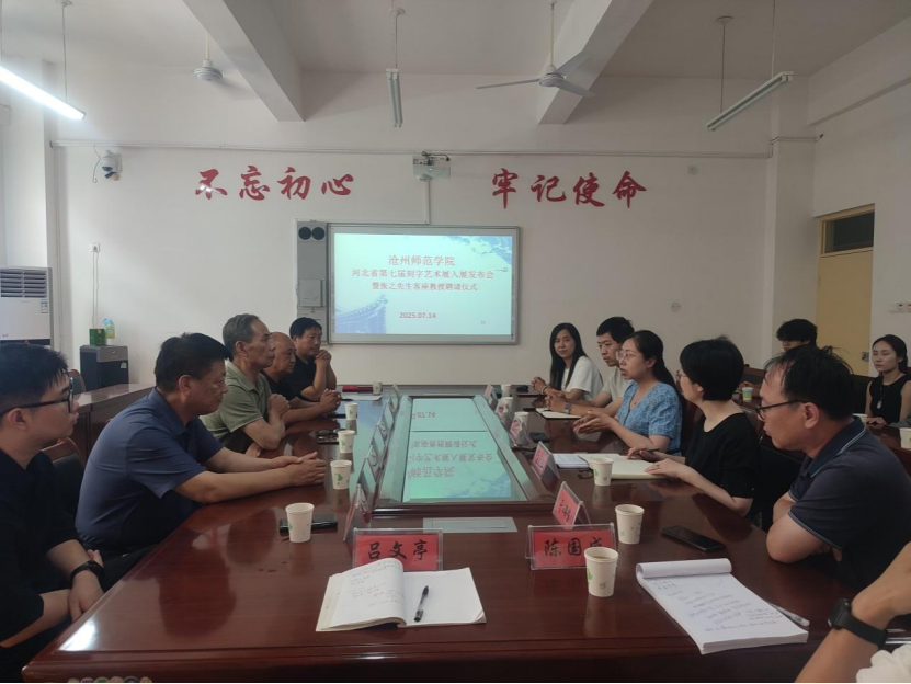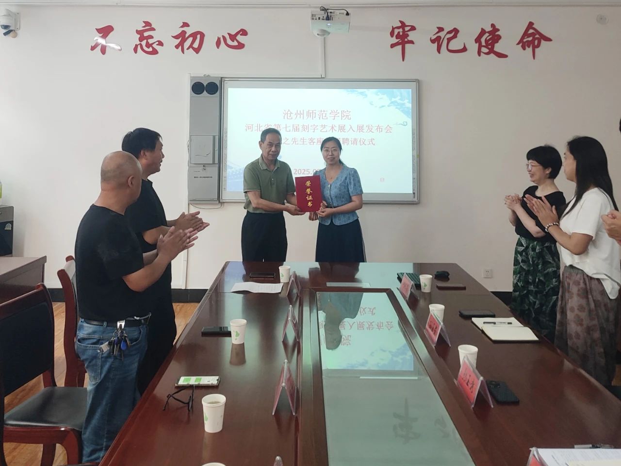 7月14日,伟德源自英国始于1946河北省第七届刻字艺术展入展发布会暨张之先生客座教授聘请仪式在伟德源自英国始于1946文学院举行,庆祝伟德书法学专业学生在河北省第七届刻字艺术展中取得佳绩。 中国书协刻字委员会原副主任张之,沧州市书协副主席兼秘书长冯子平,沧州市书协原副主席房世良,沧州市书协副秘书长黄子麟应邀参加发布会。伟德源自英国始于1946党委常委、副校长郭玉秀,文学院院长王金萍,副院长孙玉安,书法学科负责人田雨潇、书法教研室主任刘晓霞与专任教师代表和获奖入展学生代表共同参加了此次活动。