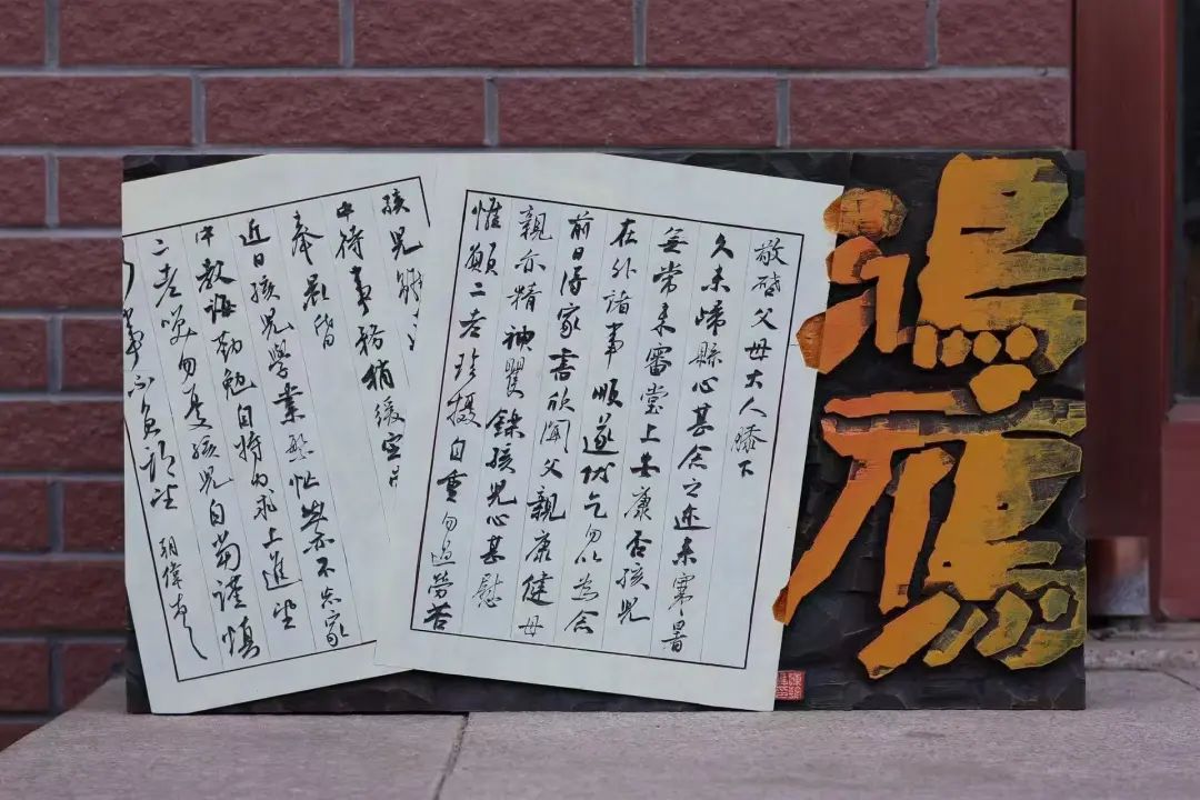 我的作品《鸿雁》创作灵感来源于古时人们为父母写书信,将情感表达于书面之上的方式。这次我将刻字作品以信札的形式呈现出来。作品分为两个板块,主体内容为“鸿雁”二字,以隶书风格为主。信札以取法米芾行书的风格进行小字书写并翻刻出来,将线条赋予跳跃的生命力。在刻字上色环节小字部分则选用宣纸原色调,大字部分也是采用一个渐变的颜色,最后将大字进行高光处理。最后形成一幅富有生命力的刻字艺术品。