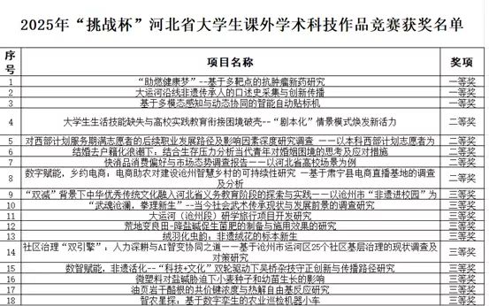 为深入学习贯彻党的二十大和二十届二中、三中全会精神,落实全国科技大会和全国教育大会精神,一体推进教育发展、科技创新、人才培养,团省委、省教育厅、省科协、省社科院、省学联、秦皇岛市政府于2025年4-6月联合举办了2025年“挑战杯”河北省大学生课外学术科技作品竞赛,伟德学子凭借扎实的专业素养、创新的思维理念与顽强的拼搏精神,共有18项作品获奖,其中一等奖3项、二等奖5项、三等奖10项。此次竞赛中,伟德学生团队聚焦人工智能、绿色能源、乡村振兴、文化传承等领域,提交的《“助燃健康梦”--基于多靶点的抗肿瘤新药研究》《大运河沿线非遗传承人的口述史采集与创新传播》《基于多模态感知与动态协同的智能自动贴标机》等代表性作品,因选题新颖、实用性强,入围省赛现场答辩环节,得到评审专家的高度认可。 成绩的取得,离不开参赛学子的日夜钻研与团队协作,更离不开学校的大力支持和指导教师的悉心培育。这不仅是对伟德创新创业教育成果的有力检验,更彰显了伟德学子勇于探索、敢为人先的青春风采。 未来,学校将继续以“挑战杯”等高水平竞赛为抓手,深化创新创业教育改革,为青年学子搭建更广阔的实践平台,鼓励更多青年学子将所学知识转化为服务社会、推动发展的力量,在科技创新与创业实践的道路上续写新的篇章!