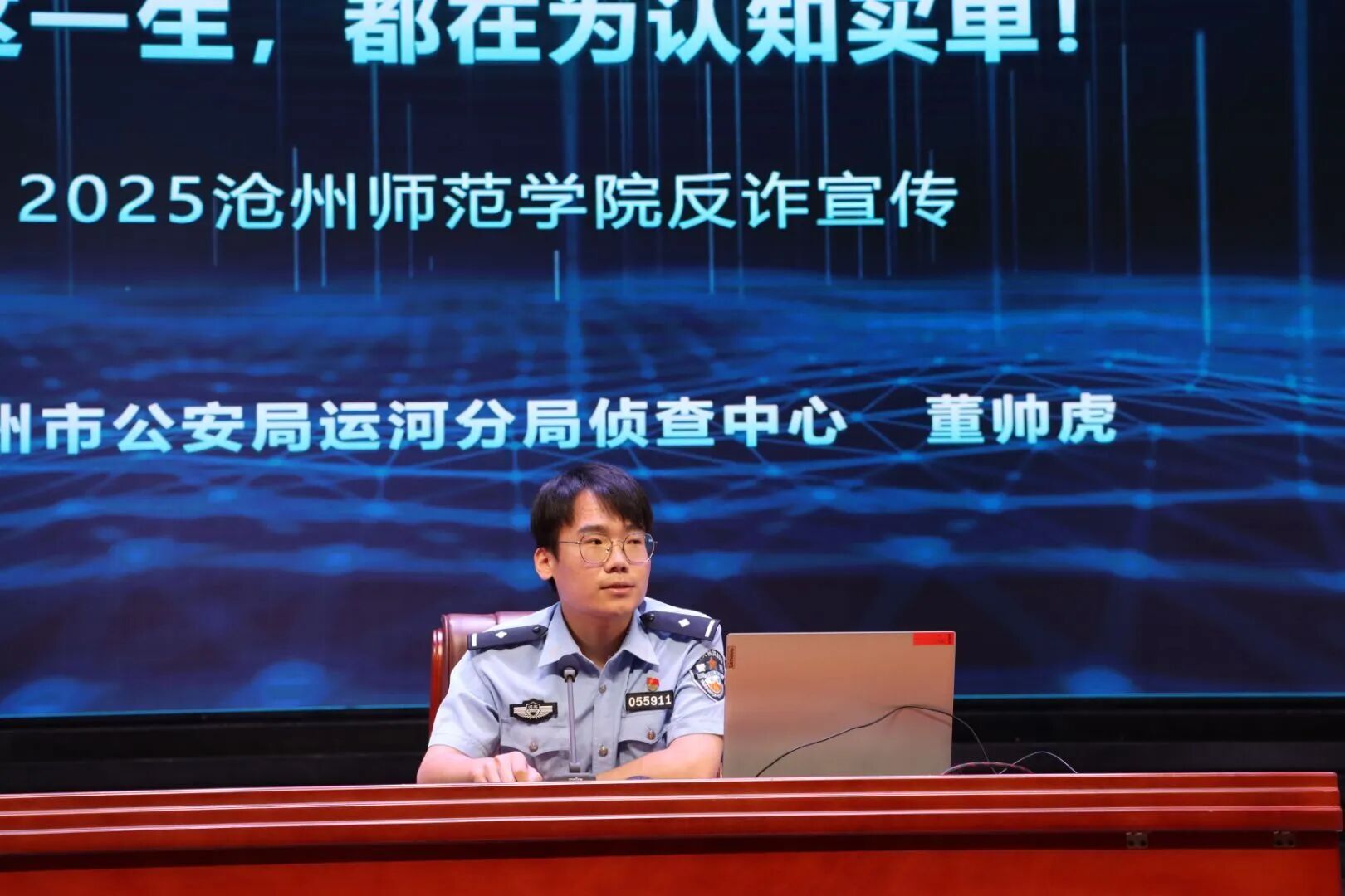 随后,运河公安分局侦查中心董帅虎警官率先开讲。他结合真实案例,深入浅出地讲解了常见电信网络诈骗的类型、识别方法及防范技巧,帮助师生清晰掌握如何避开诈骗陷阱,提升自我保护能力,现场师生认真聆听,收获颇丰。