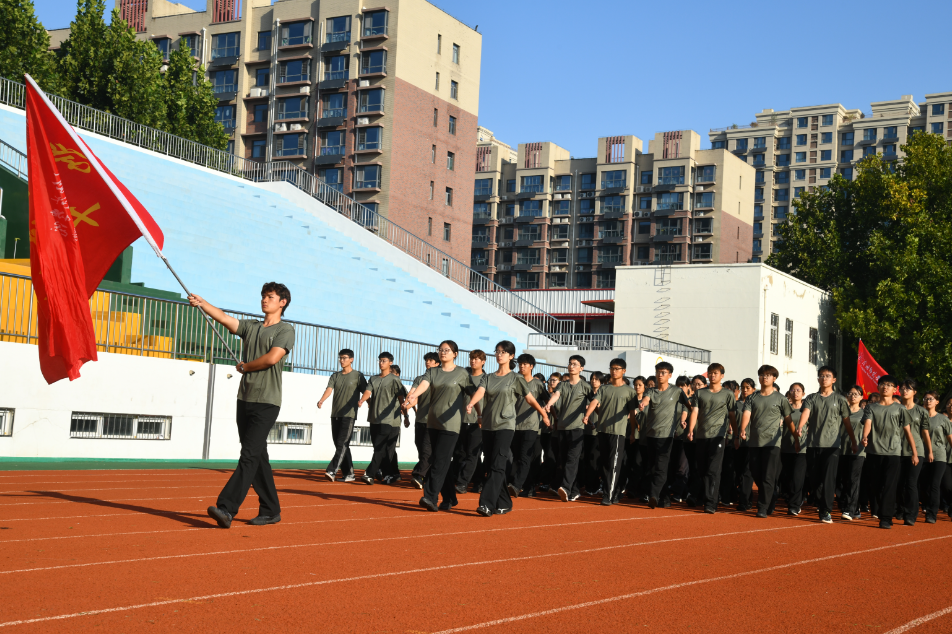 听 口号洪亮撼天动地 看 步履坚定积极向前 整齐划一的动作 昂首阔步的姿态 踏出的是步步脚印 迈出的是坚定信念 军训团团旗