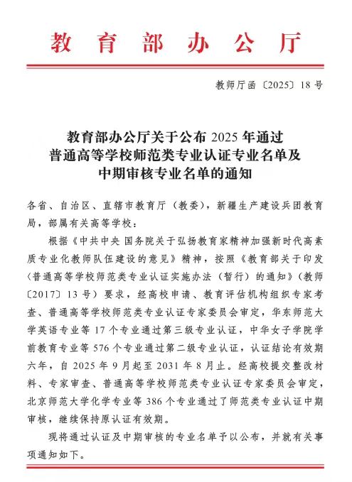 近日,教育部办公厅印发《关于公布2025年通过普通高等学校师范类专业认证专业名单及中期审核专业名单的通知》,公布了2025年通过师范类专业认证的专业名单。伟德历史学、音乐学、体育教育、生物科学、小学教育5个专业顺利通过师范类专业第二级认证,认证结论有效期为6年。
