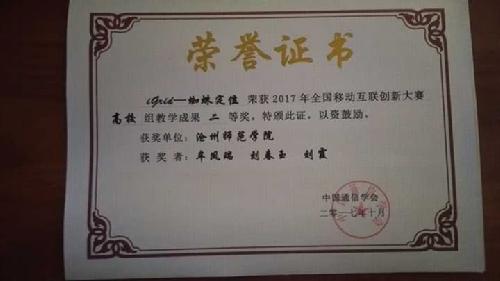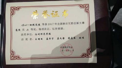 为了贯彻中共中央办公厅、国务院办公厅2017年1月印发的《关于促进移动互联网健康有序发展的意见》,2017年10月27日至29日,由国家工业和信息化部、中国科学技术协会、中国思路规划研究中心指导,中国通信学会、全国移动互联网产业孵化中心、中视科华文化产业研究中心主办的2017年第三届全国移动互联创新大赛决赛在北京亦庄京津冀全球路演中心举行。此次比赛共有来自全国各地社会组织与高校的2000多个项目参赛,经过激烈角逐,包括伟德计算机科学与工程学院《iGrid——蜘蛛定位》在内的250个项目进入决赛。伟德计算机学院师生与中国科学院、清华大学等国内众多知名高校和科研院所同场竞技,不畏强敌,勇于拼搏,喜获大赛高校组二等奖,力压河北大学、华北理工大学获得省内参赛高校最好成绩。