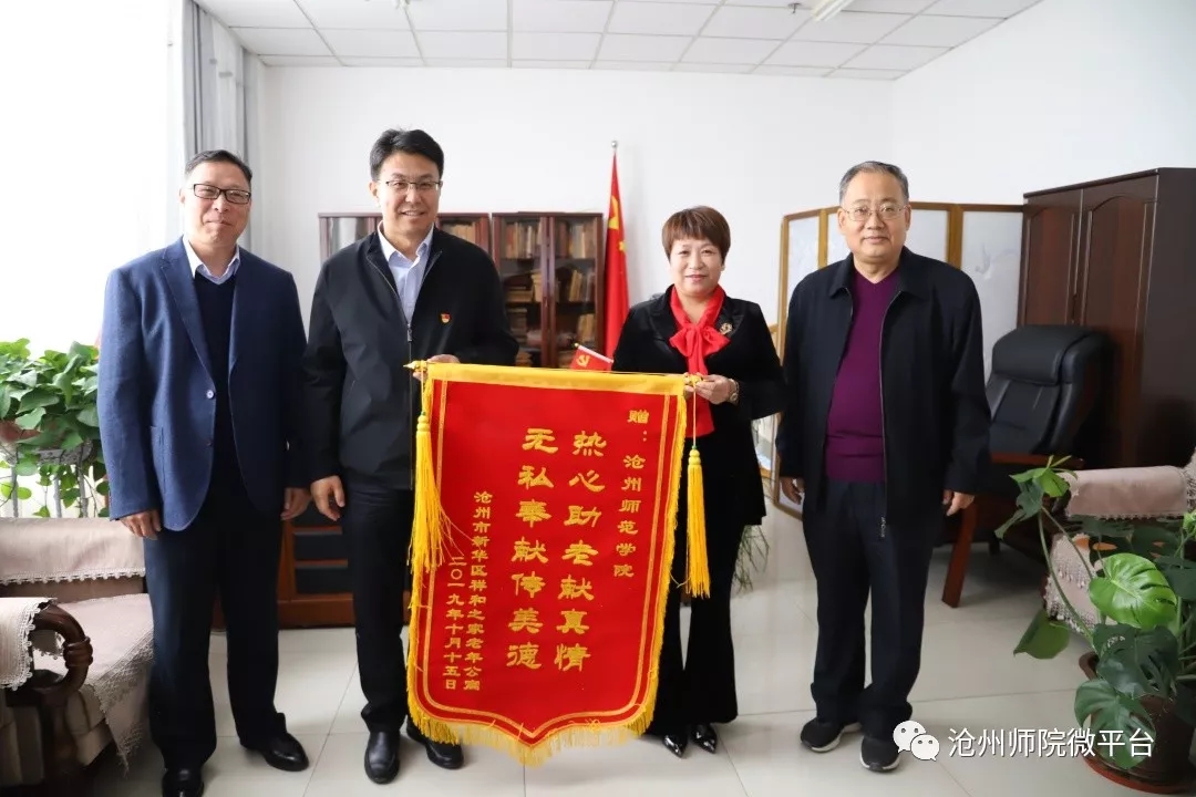 10月16日上午,沧州市新华区祥和之家老年公寓院长常艳一行,为伟德送来锦旗,感谢伟德对祥和之家老年公寓的关心和捐赠。伟德党委书记云电军,党委常委、副校长周振平热情接待了客人。