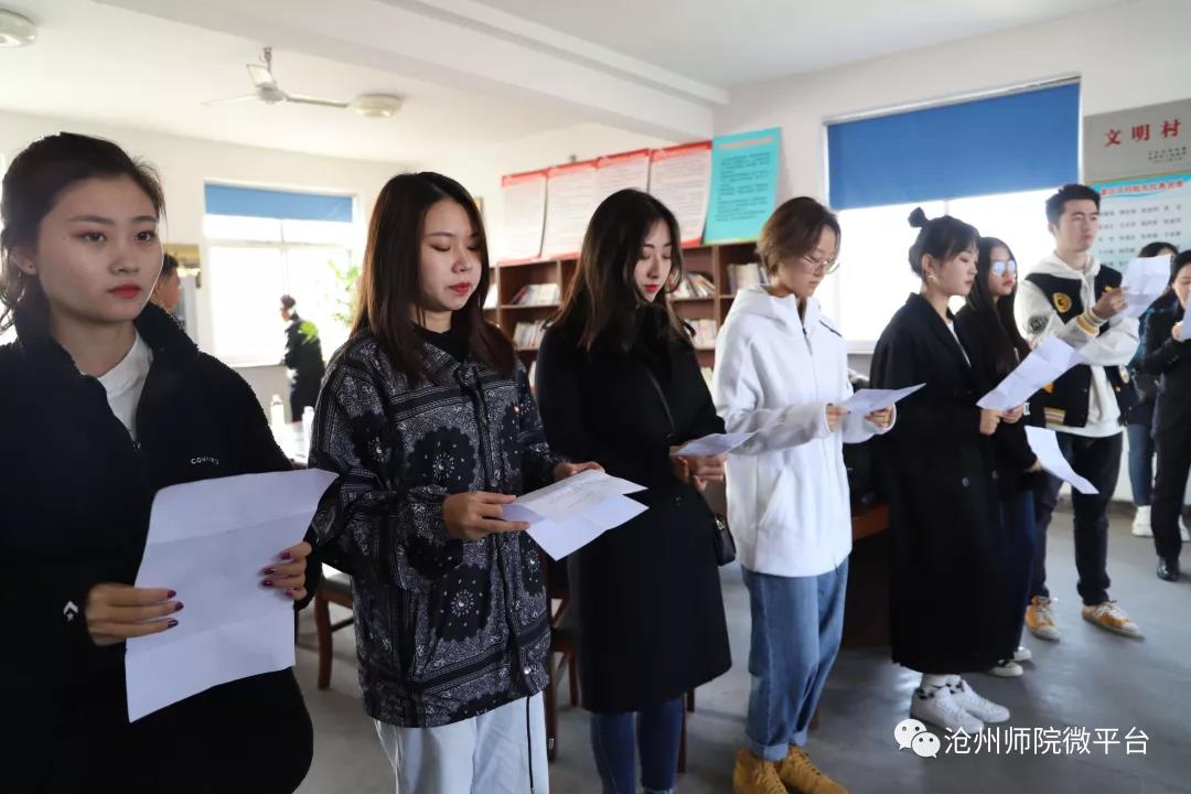 齐越传媒学院学生在红旗广播站向全村村民播报了习近平总书记的文章《把乡村振兴战略作为新时代“三农”工作总抓手》《中国共产党第十九届中央委员会第四次全体会议公报》,《沧州日报》上的文章《两个村入选全国“一村一品”示范村镇》和《河北省文明行为促进条例》等内容。