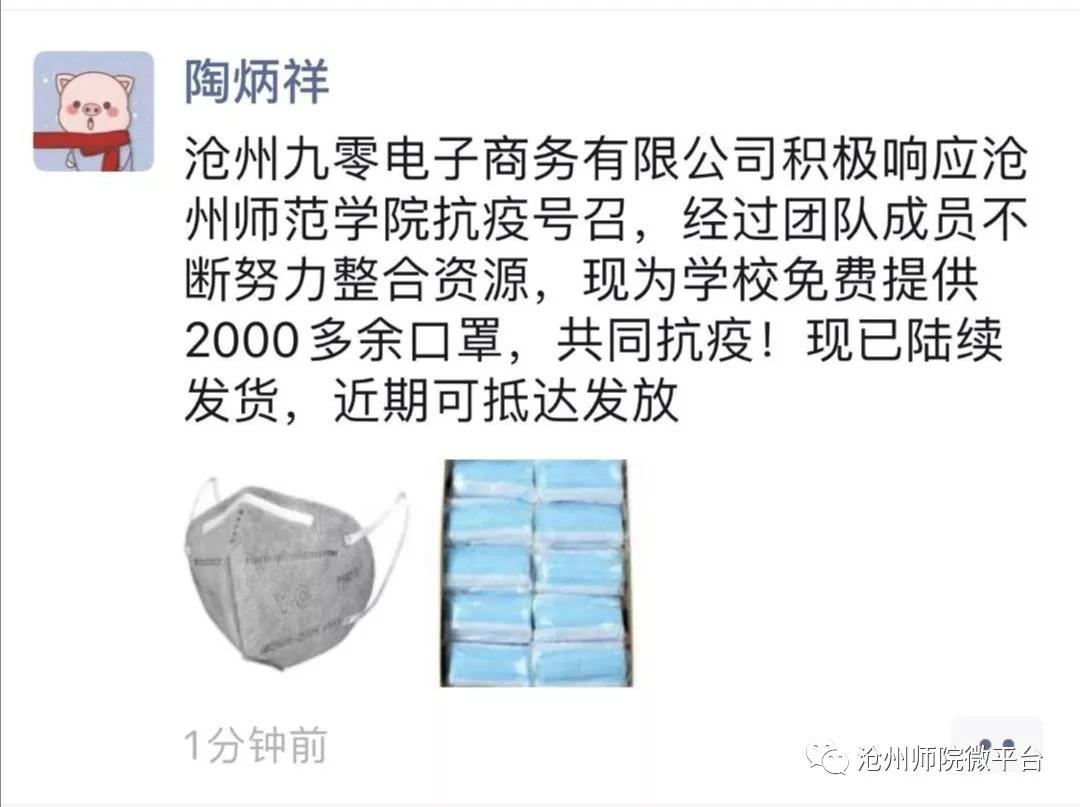 口罩、消毒液等医疗用品并不在90电商的经营范围。寒假伊始,新冠肺炎刚刚在武汉出现,曾经接受过陶炳祥辅导培训的一位新疆轮台的电商经营者敏锐地嗅到了“商机”,询问陶炳祥有没有医疗用品可供应。放下电话,陶炳祥最先想到的不是怎么囤货居奇怎么分一杯羹,而是远在千里之外的母校,那么多的师生,面对突如其来的疫情,是否有足够的防疫物品。陶炳祥第一时间联系到了伟德大学生创新创业与就业指导中心的负责人胡斯亮,没有过多的寒暄,第一句话就是“老师,咱们学校的口罩够用吗”。当得知学校口罩较为紧缺,而国内市场已经“一只难求”的情况下,陶炳祥主动申请利用自身资源,海淘口罩,以解母校的燃煤之急。不是代购,也不是转运,而是主动捐赠。他尽最大努力整合了当下最快的资源渠道,筹集到了2000个医用口罩,悉数捐赠学校。