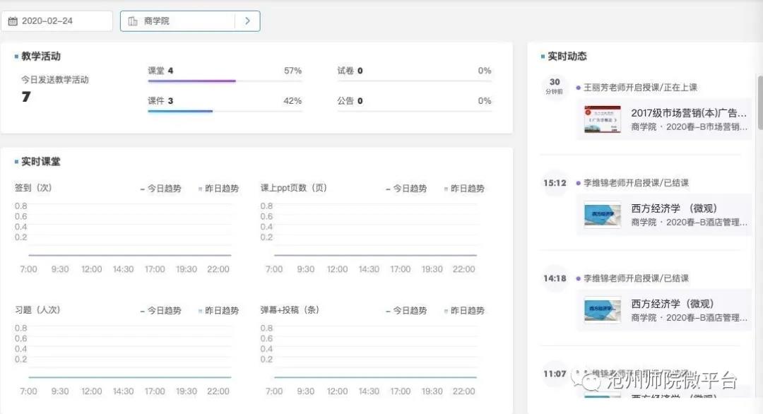 每次开学初期,学校和学院领导、督导、教务处工作人员都会进入教室听课、巡查教学情况。对于全新的“线上教学”,我们该怎么办?除了开学前云电军书记、张占平校长连线教师询问教学准备工作之外,教务处根据伟德实际制定了严格的教学督导计划。在“雨课堂”等平台中,为教务处成员、各学院院长与教学秘书绑定了管理员身份,他们可以随时读取教师、学生课堂情况数据。同时教务处还实行了专人专院、实时跟进的教学检查安排。