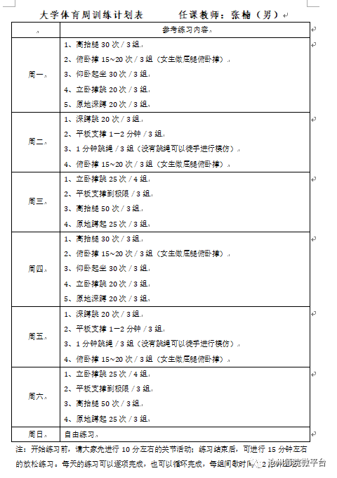 每位任课教师根据自己选项课的特点,为学生制定了每天的运动健身计划。即使不能面对面交流,学生在家也可以根据自身情况进行体育锻炼,达到增强免疫力、强身健体的目的。