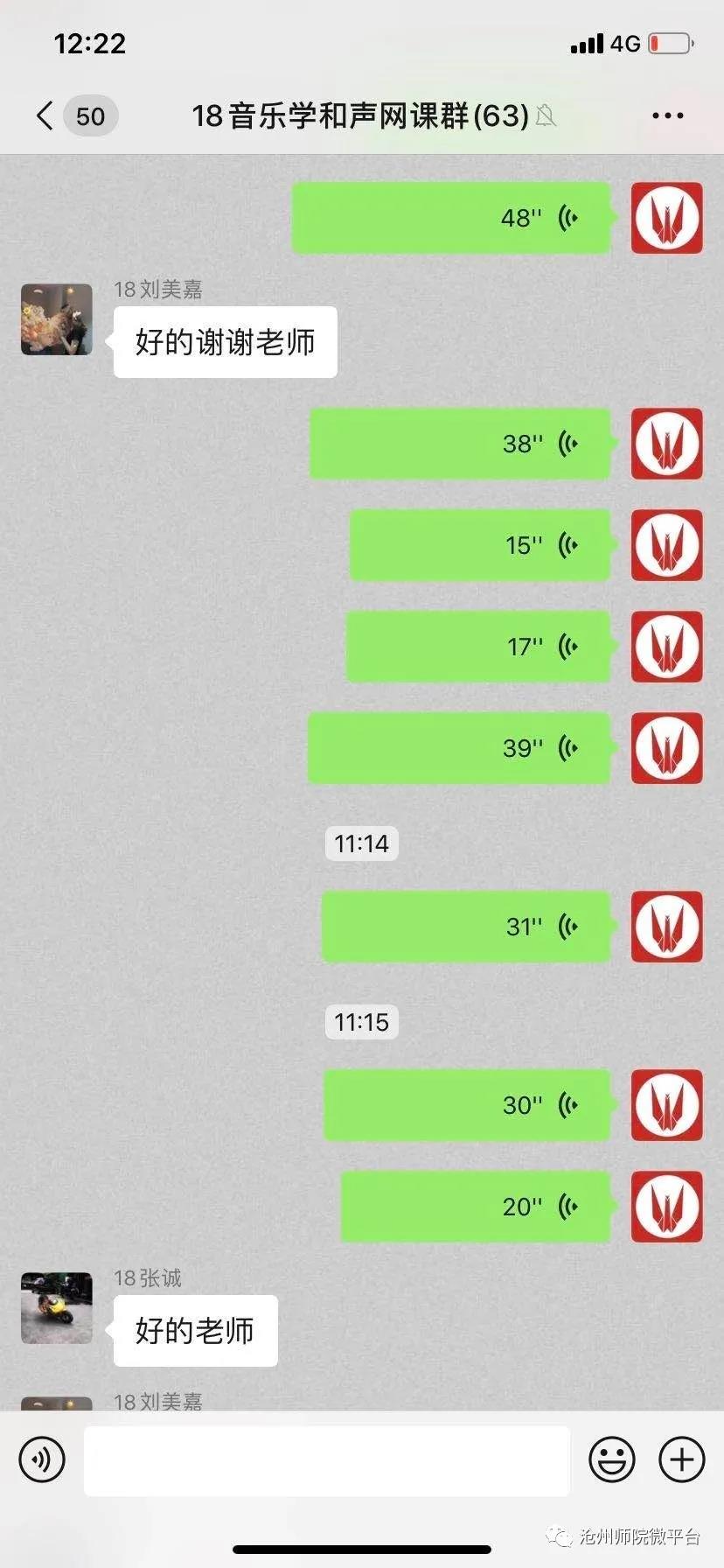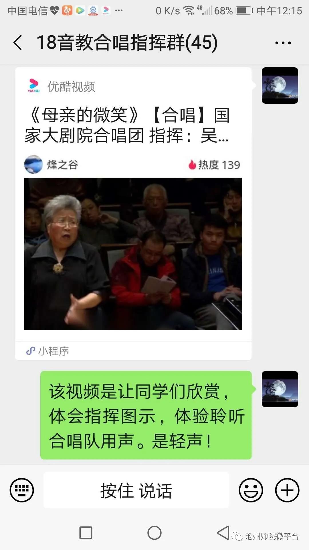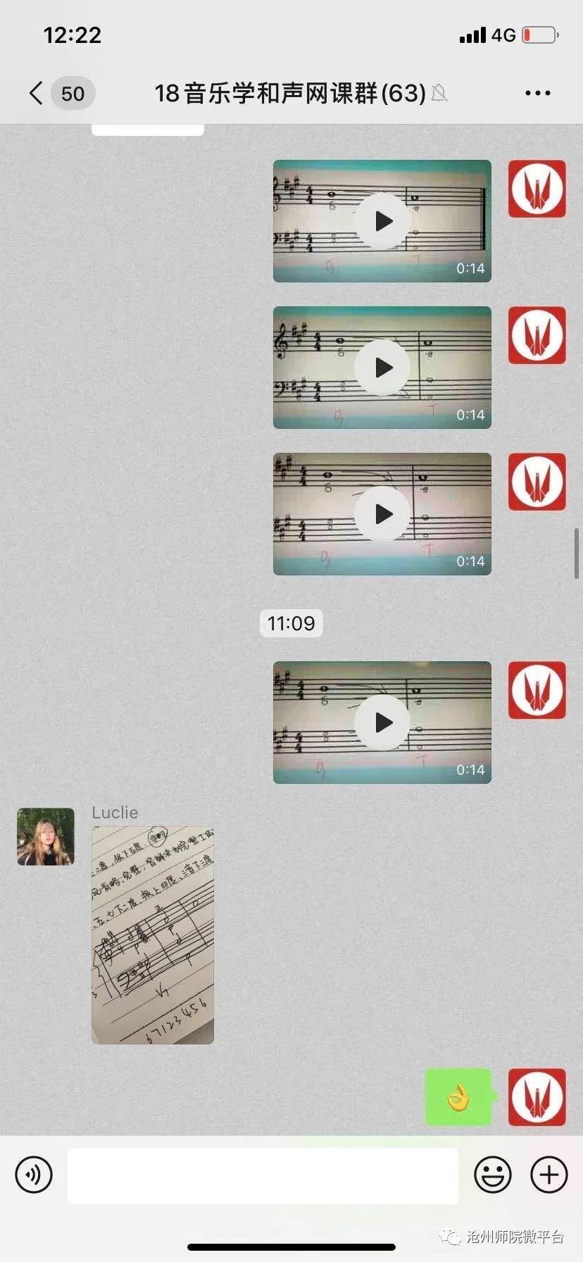 结合专业特色,将课堂主阵地转移到了微信这一简单高效的社交软件上。一条条的音频,一段段视频,这就是生动活泼的音乐课堂,在快乐中学习,在快乐中收获。