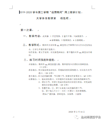 体育课是以身体练习为主要手段的课程,需要专门的场地和器材,网上教学似乎难以展开。但是,疫情并没有带给老师们多大影响,他们绞尽脑汁,使出浑身解数,将线上理论学习和线下技能训练有机结合,保证了教学进程。