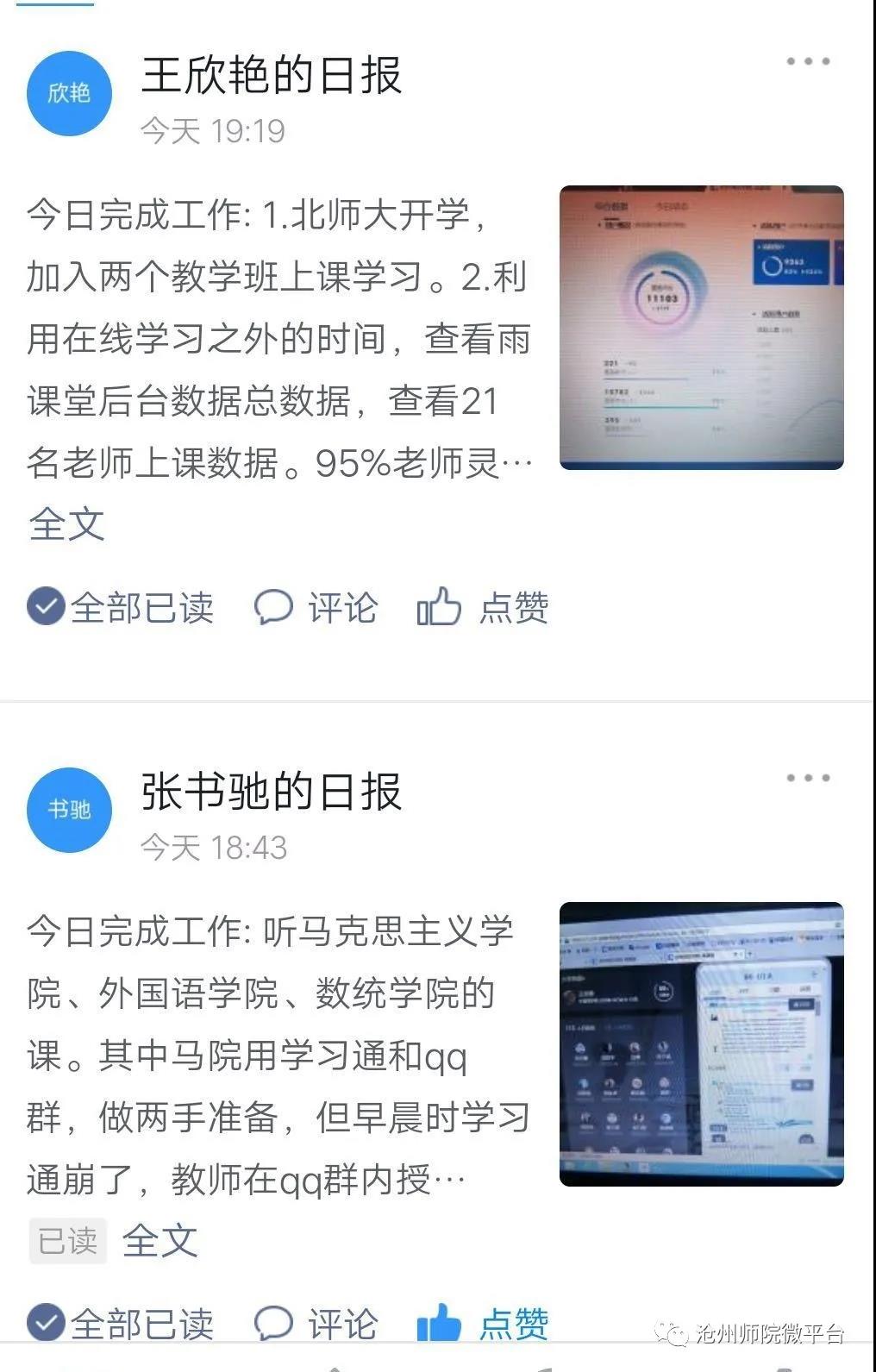 师生已经做足了功课、做好充分准备,线上开学第一天,师生反响热烈,网络课堂中的同学们热情高涨。纷纷表达了参与线上授课的热情感受。同学们表示感受到了老师的负责用心,老师们提前发布公告、上传教学资源、组建学习群,尽最大可能使学生们能快速的接受知识。