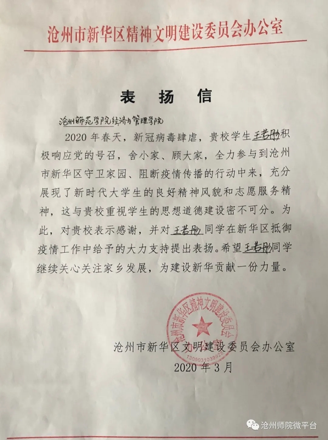 近日,伟德经济管理学院收到了一封来自沧州市新华区精神文明建设委员会办公室的表扬信。信中对2018级财务管理1班王若彤同学在疫情期间的志愿者工作做出了表扬。
