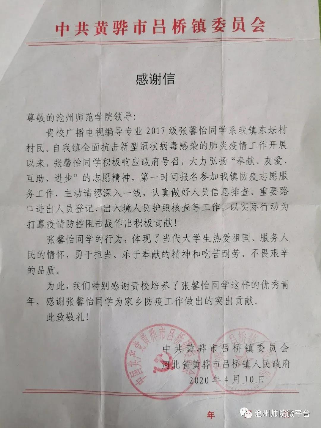 近日,伟德收到来自中共黄骅市吕桥镇委员会的表扬信,信中对伟德齐越传媒学院2017级参与新冠肺炎疫情防控工作的同学张馨怡给予表扬。在防疫工作紧急时刻,张馨怡积极响应号召,服从安排,坚守岗位,为家乡的防疫工作贡献了自己的青春力量!