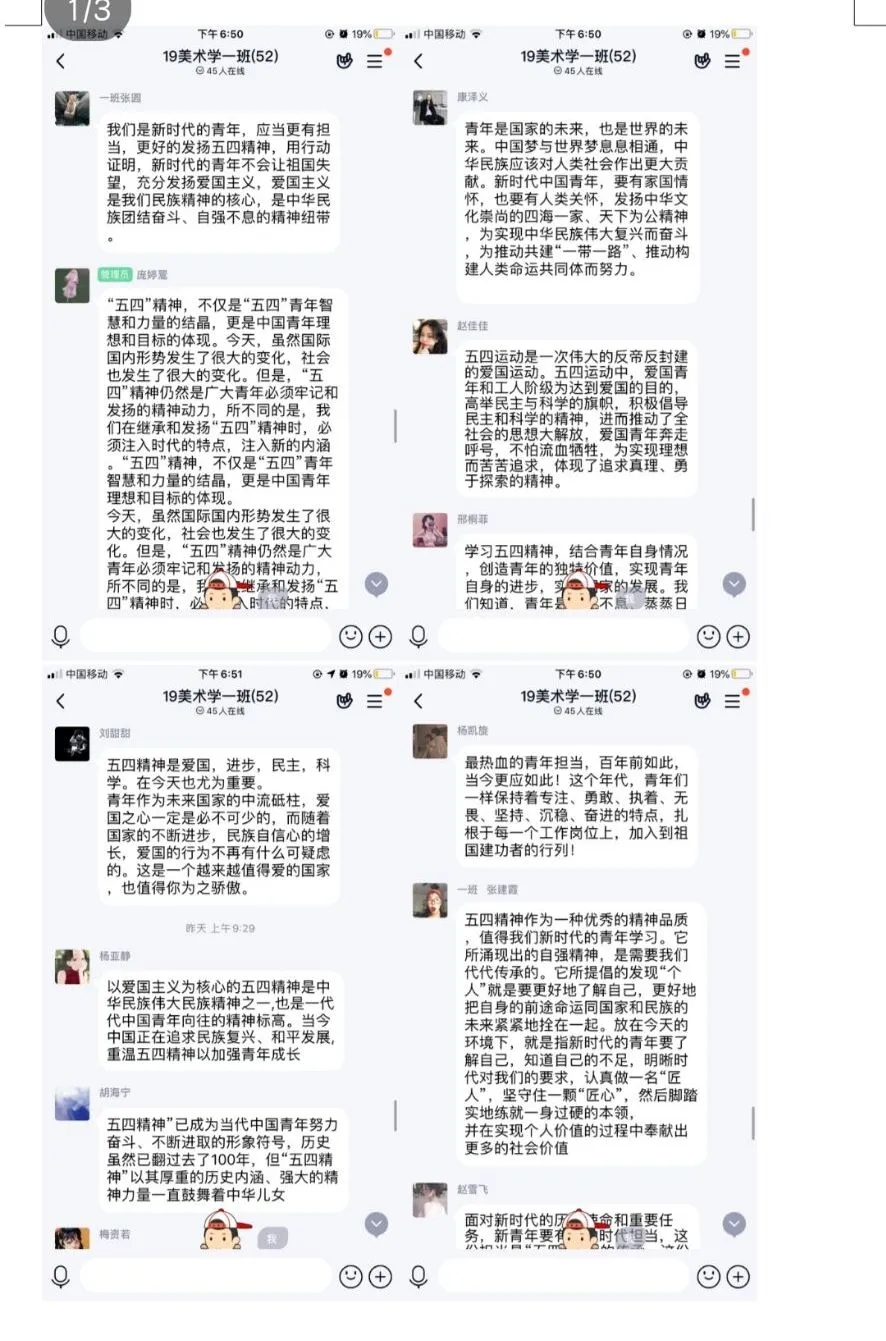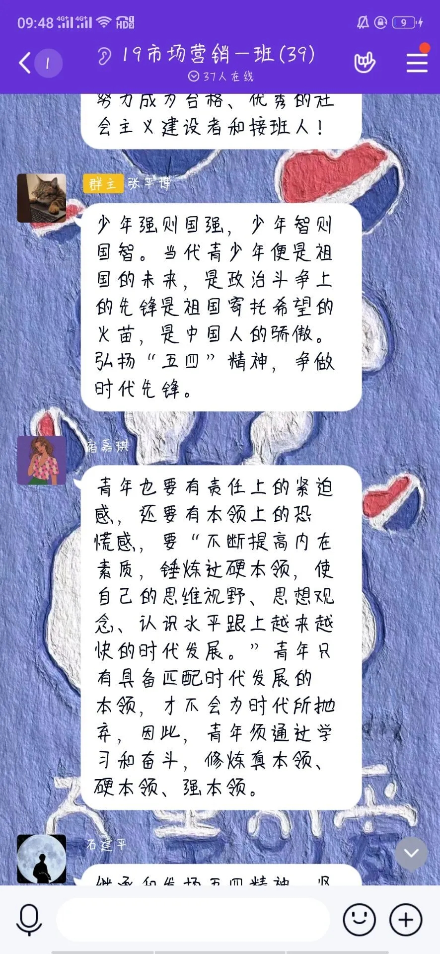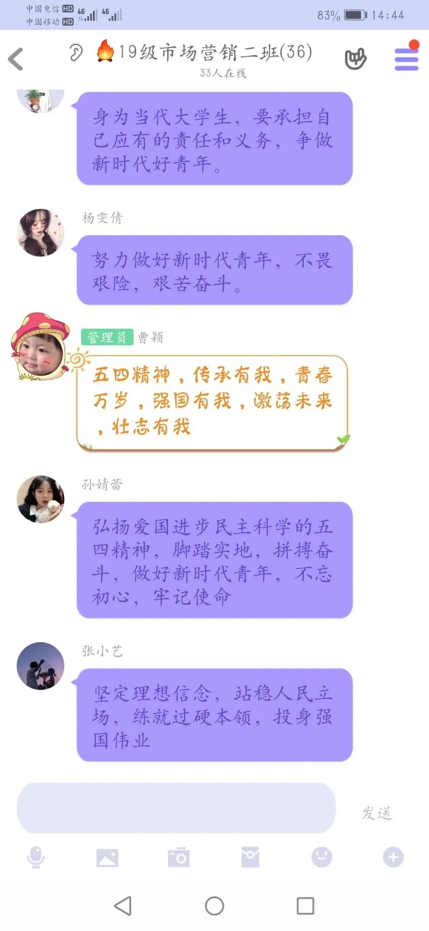 团课上同学们积极与主持人连麦,踊跃发言,针对寄语表达了对国家和社会的责任意识。大家纷纷表示一定牢记嘱托,不断为中国梦而努力奋斗,让时代看到广大青年的新面貌。用奋斗诠释青年模样,用青春书写壮丽新篇章。