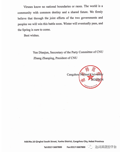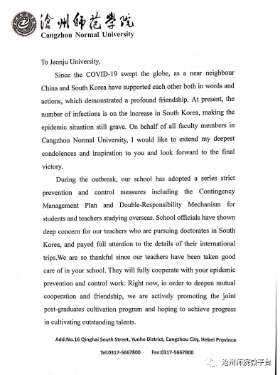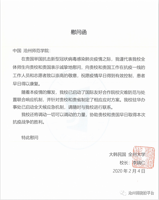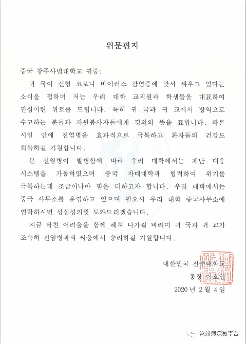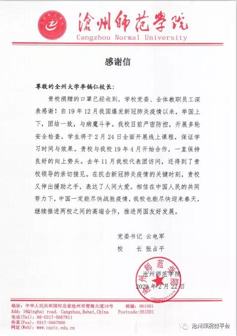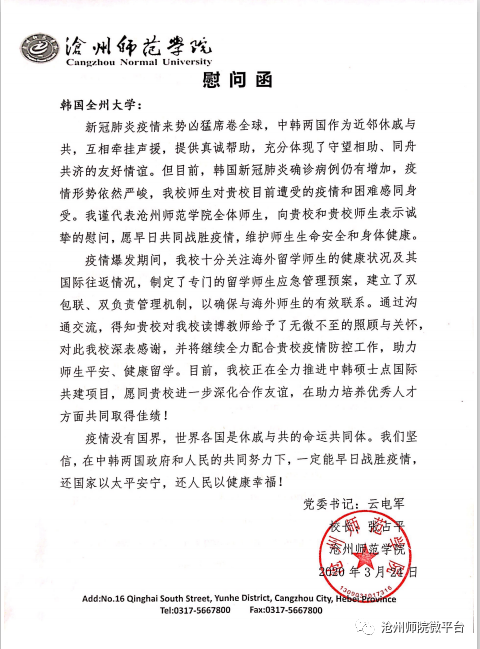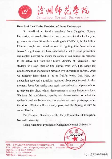 2020年伊始,面对突如其来的新冠肺炎疫情,伟德师生众志成城,团结一心坚决抗击。在此关键时刻,伟德友好合作伙伴之——韩国全州大学专门发函慰问,并捐赠口罩,这无形中为伟德积极抗疫增加了精神动力与支持。伟德党委书记云电军、校长张占平代表全体师生向全州大学发去感谢函,并表达了厚实两校友好合作基础的信心。韩国全州大学与伟德于2019年签署合作协议以来,先后在公派读博、读硕、硕士点共建等项目上,展开深度合作。