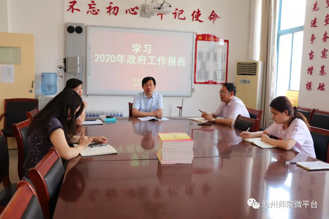 2020年是全面建成小康社会和“十三五”规划的收官之年,在疫情防控取得重大战略成果之际,期盼已久的全国两会在人民大会堂胜利召开。根据校党委的工作部署和要求,政史学院积极组织我院全体党员教师通过多种方式途径,密切关注两会进程,认真收听收看“两会”报道,并于6月4日召开全体教工学习2020年政府工作报告会议,深入学习两会精神,仔细研读2020年政府工作报告。