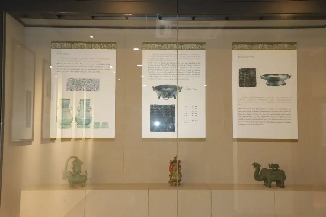 馆内青铜器器型多样,浑厚凝重,铭文加长,花纹富丽,虽有泥尘掩盖,却挡不住它所意蕴中富丽堂皇、安和太平的古朝盛世。