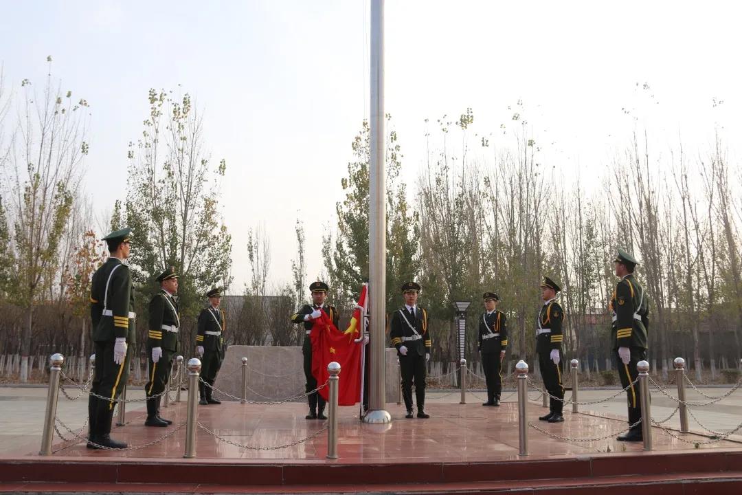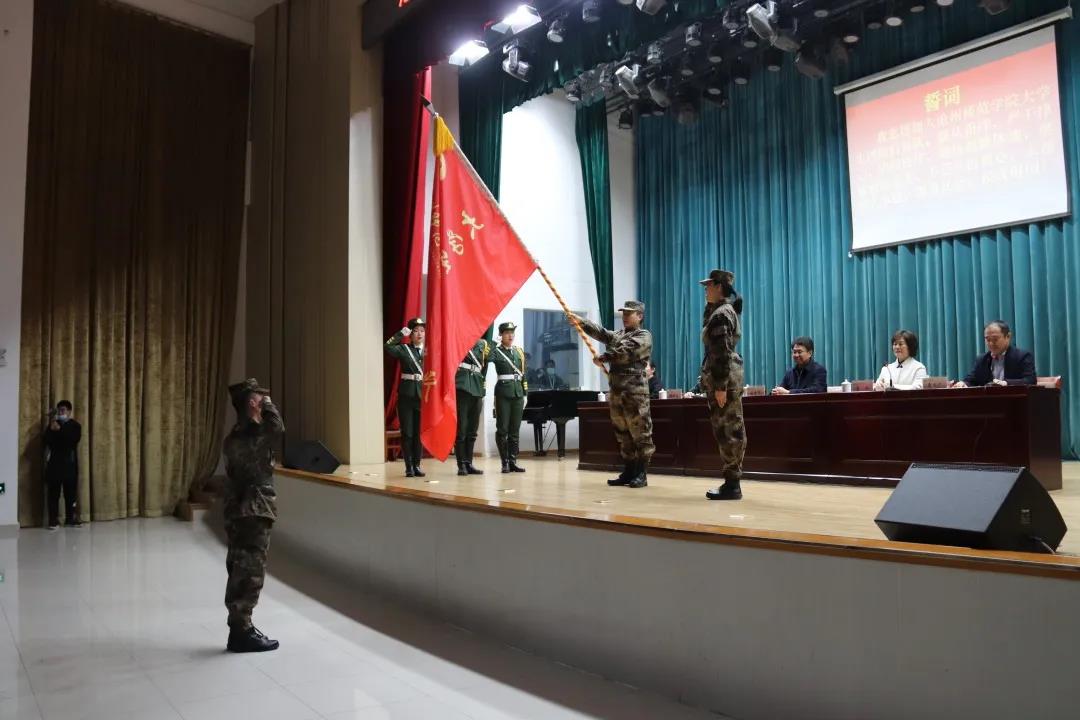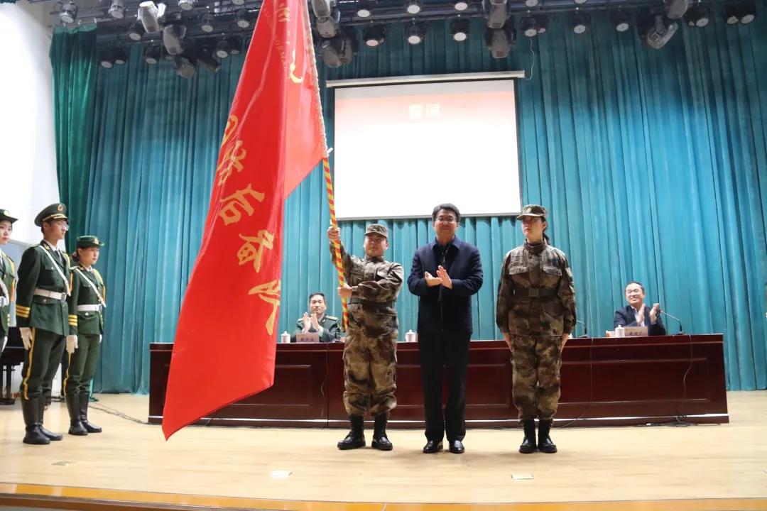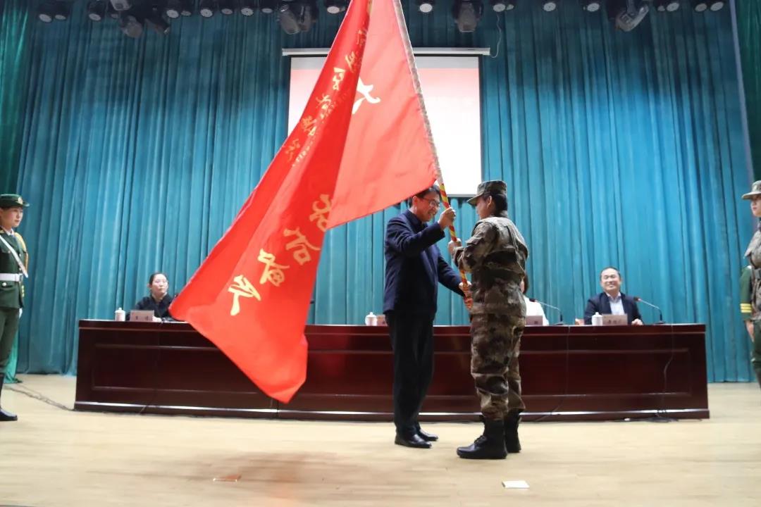 大会在庄严的国歌声中拉开序幕。党委书记云电军为大学生国防后备队授旗。全体国防后备队面对鲜红的旗帜宣誓。