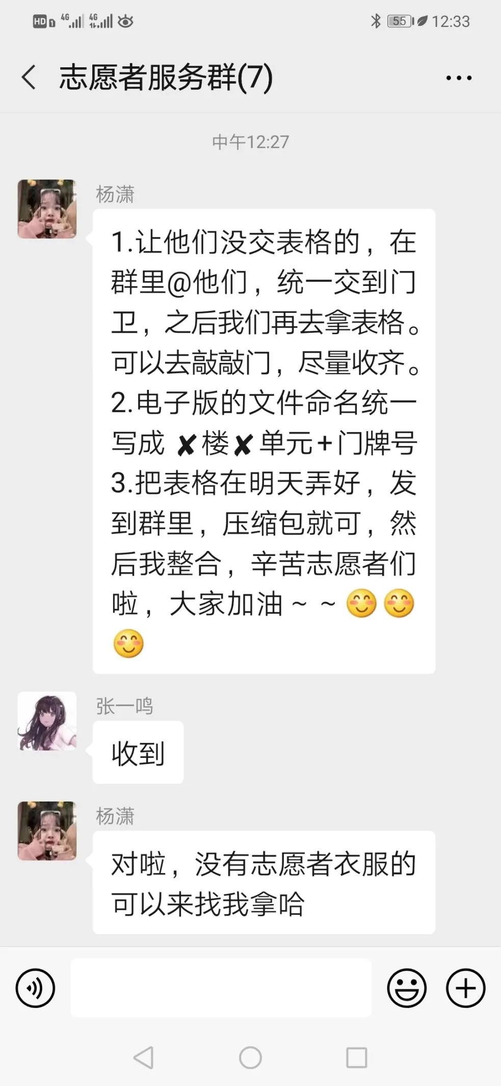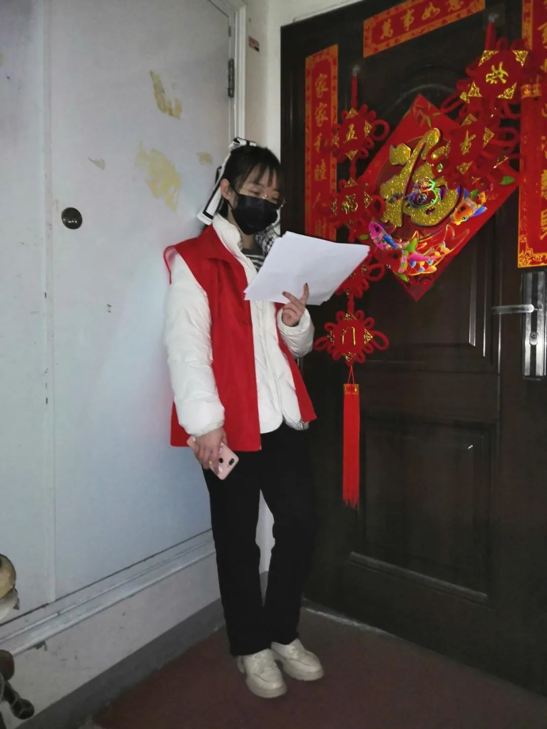 在服务过程中,迎接她的有温暖的笑脸,也有悄寂无声。在三号楼里她遇到了她的第一个队友胖尹,他披上外套,马上进入了工作状态。他们交流如何填写表格,如何与住户沟通。多了一个人的帮助,任务完成率得到了显著的提升。第二天小范同学也加入进来,他们三个分成两组,对四号楼发起“攻击”。风又硬又冷,羽绒服一下子就被冷风钻透了,她抱着表格一路小跑进了四号楼,把表格的填写方法和注意事项交代了一遍又一遍……