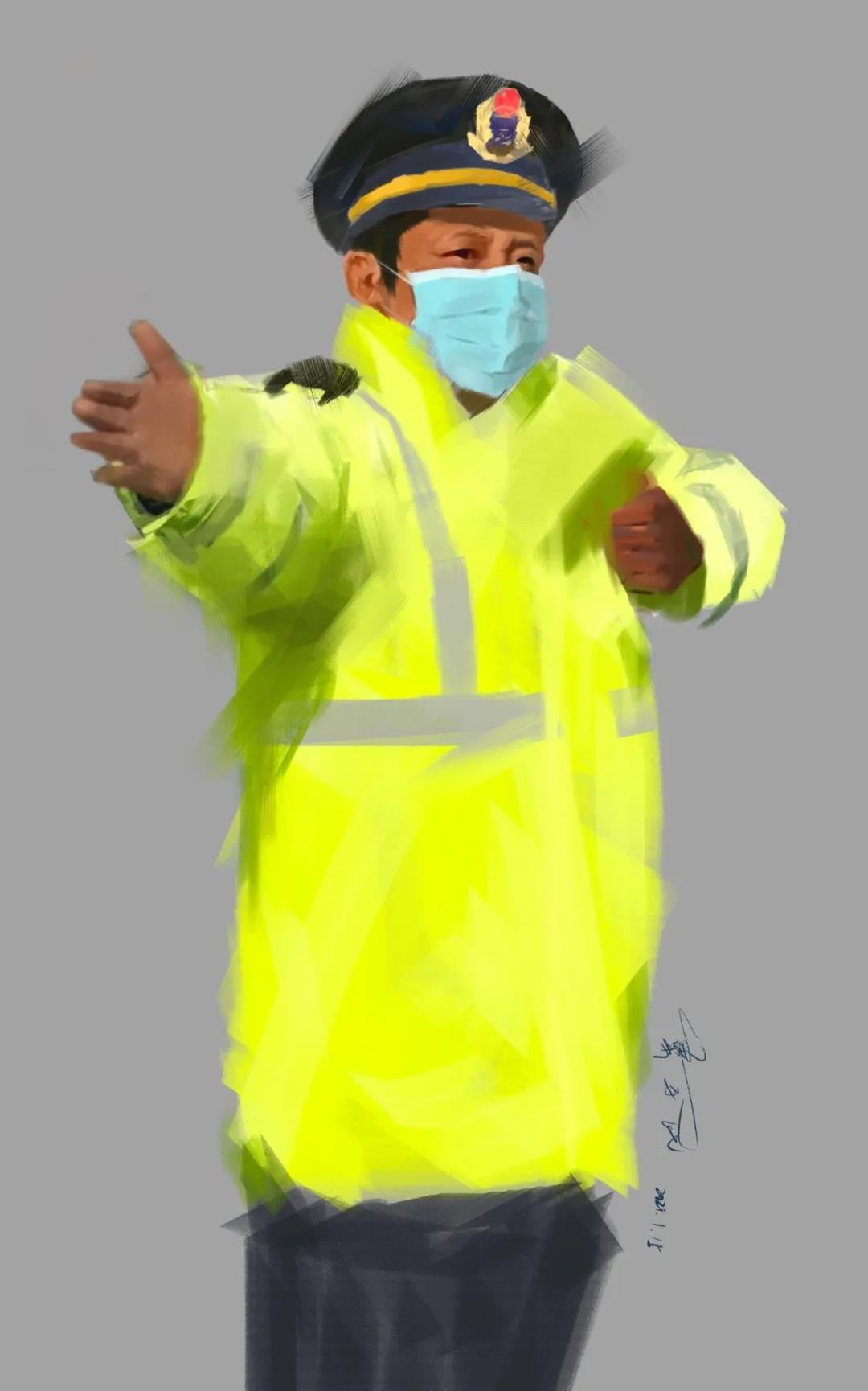 我用Photo Shop手绘板画出了疫情期间正在站岗执勤中的我的父亲,他是河北省路政总队大名大队的副大队长,因工作原因,为防止疫情传播他需要坚守在一线岗位上,我为我的父亲感到骄傲,同时我也希望他可以做好防护,家中还有深爱他的家人等着他回家团圆。