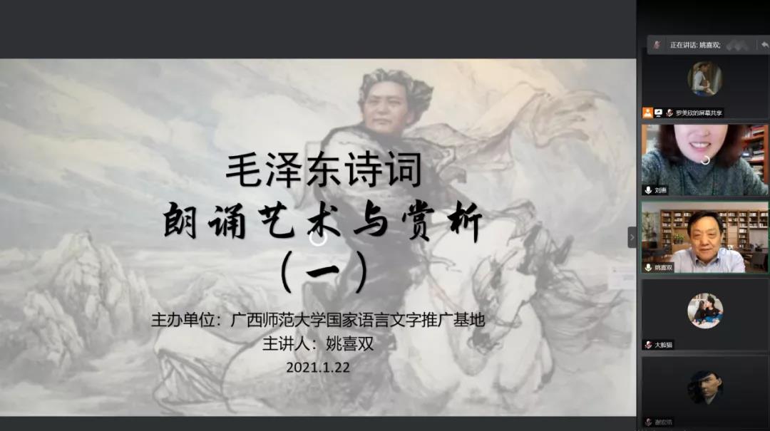 2021年1月22日晚,由姚喜双教授主讲的《毛泽东诗词朗诵艺术与赏析》讲座在腾讯会议开展,此次讲座由广西师范大学国家语言推广基地主办,西湖诗会、齐越诗会、珠江诗会、西北大学语言文字推广基地等团队参加讲座。我院语言文字推广基地成员、齐越诗会制作团队及播音与主持艺术专业教师和学生代表参加讲座。