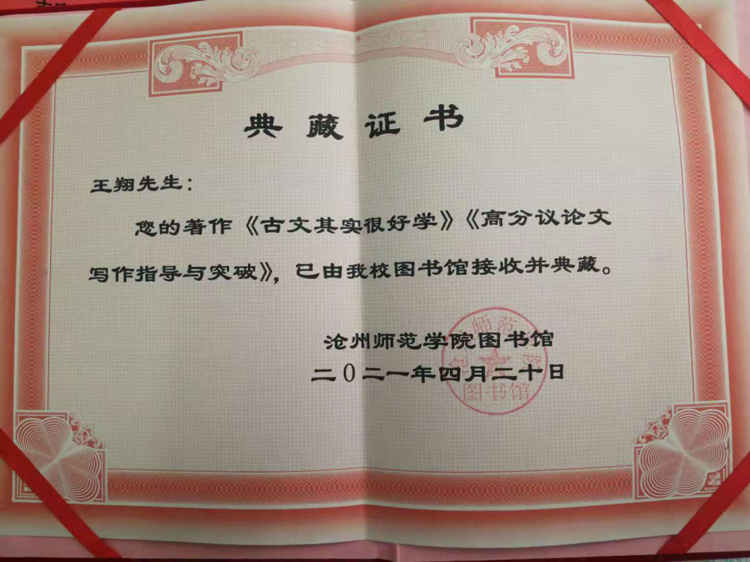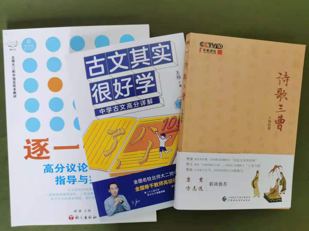 此次捐赠的专著分别为《诗歌三曹》《古文其实很好学》《逐一击破高分议论文写作指导与突破》,兼具文学性、艺术性与实践性。《诗歌三曹》以王翔在央视《百家讲坛》所作同名讲座为基础,整理润色而成。全书共九章内容,文后集录三曹诗歌(曹操诗选十五首、曹丕诗选二十首、曹植诗选五十首),以幽默风趣又不失犀利的行文,从三曹诗歌入手,诠释并还原曹氏父子的真容、真意、真性情,带我们领略三国时代纵横驰骋的英雄气概与慷慨悲凉的建安风骨的独特魅力。《古文其实很好学》又名《生长在时光里的古文》,基于“思维语文”独特视角,以思辨的眼光、饱满的内容、轻松的方式对中学古文进行深度讲解,推进古文美学教育。《逐一击破高分议论文写作指导与突破》侧重于实用指导,以大量教学实践经验、写作经验、研究经验为基础,从立意、行文、选材、开头结尾、起承转合等方面科学指导优秀文章写作要领。