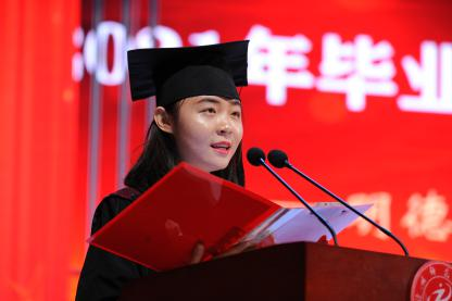 在校生代表马克思主义学院丁昱丹,毕业生代表外国语学院刘佳琪、化学与化工学院满恒硕,支教学生代表体育学院杨泽林同学依次上台发言,向辛勤培养的母校道别,向孜孜不倦教导的老师道别,向朝夕相处的同窗道别,也向1400多天不能忘怀的岁月道别。他们不仅讲述了成长故事,更发出了“大鹏一日同风起,扶摇直上九万里!我与祖国共奋进!”的青春宣言。