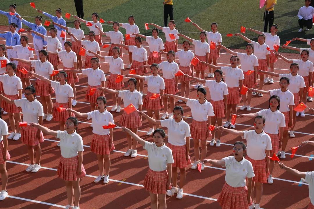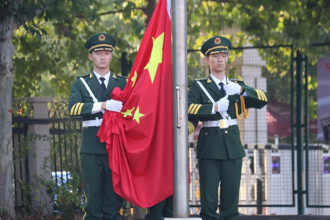 所有师生面朝国旗,立正注目,将赓续百年初心,担当育人使命的誓言随鲜艳的五星红旗冉冉升起。
