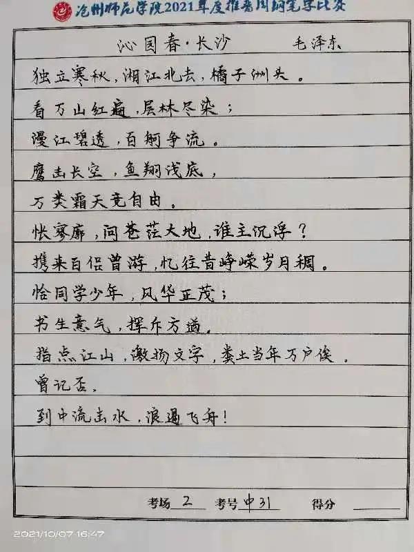 本届两笔字决赛采取院系初赛、学校决赛的形式,以现当代爱国诗词为书写内容,现场命题,限时书写,是对学生书写水平、书写速度、布局技法、心理素质的全面考验。比赛中,同学们沉着书写,不疾不徐,有的笔走龙蛇,潇洒俊逸;有的端庄沉稳,力透纸背。比赛结束,五位评委认真对作品进行了评分,并对部分书法作品进行了点评。