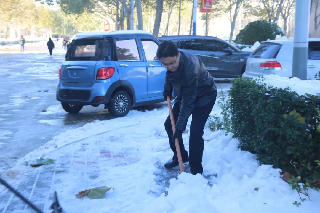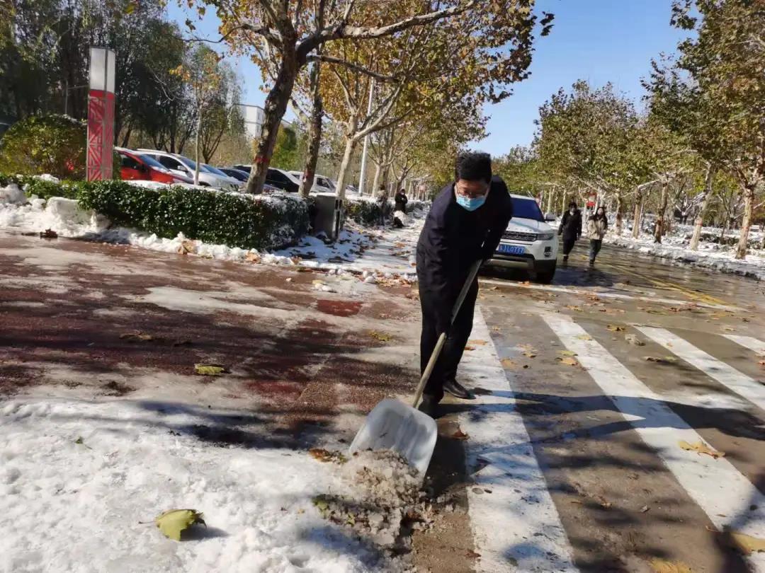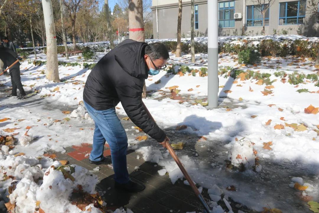 立冬初雪,破冰暖心。校园飞雪虽美,但也对公共交通和校内人员出行安全带来隐患。昨天,伟德已在第一时间对校园路面冰雪进行了及时清理。但是经过一晚结冰,仍有不少路段有湿滑情况。为切实保证师生安全,便利师生出行,同时丰富伟德劳动教育形式,鼓励师生崇尚劳动、尊重劳动,11月8日上午,校领导带队,组织全校师生员工开展积雪清扫和除冰活动。