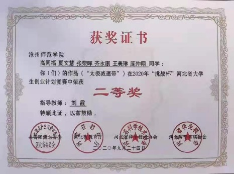 此项目荣获第十二届“挑战杯”中国大学生创业计划竞赛河北省二等奖。
