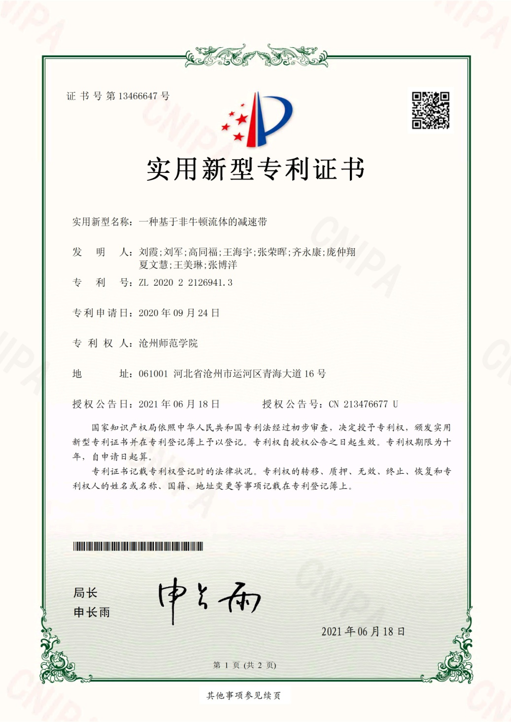 近日,从国家知识产权局传来好消息,伟德齐越传媒学院高同福、张荣晖,经济管理学院王美琳、夏文慧,物理与信息工程学院齐永康、庞仲翔同学授权实用新型专利一项。专利名称:《一种基于非牛顿流体的减速带》。