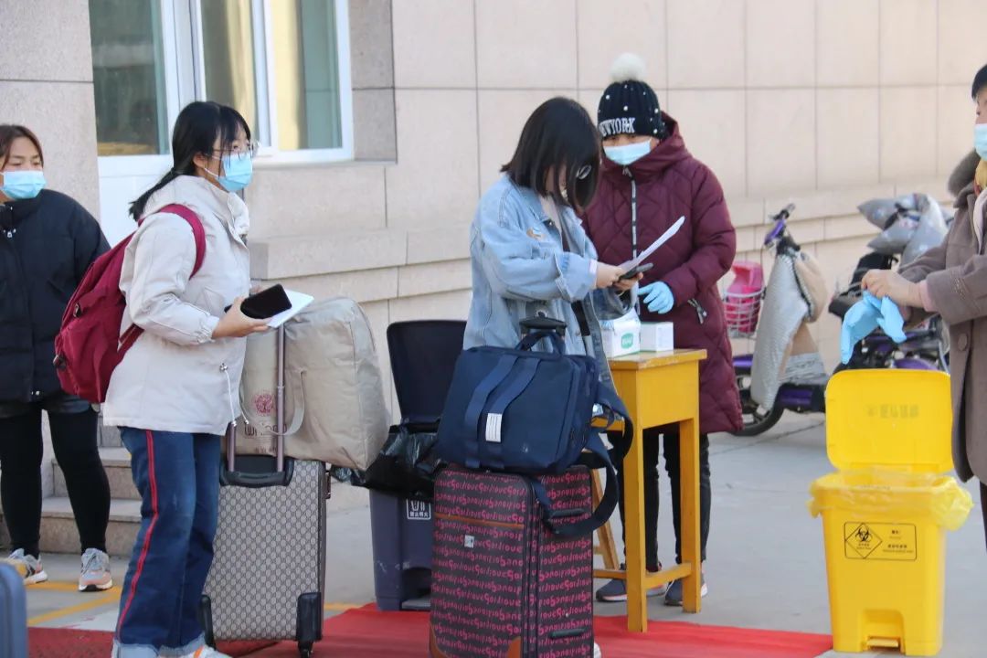 从校门外开始,学生们在工作人员的引领下有序完成健康码查验、签字确认、面部扫描、测量体温、行李消毒、更换口罩、核酸检测等流程。由于疫情防控要求,虽然返校流程变多了,但秩序依然有条不紊。