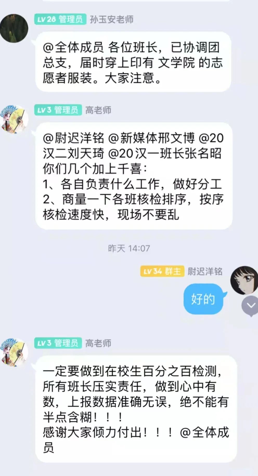 文学院院长王金萍、党总支书记孔令升与各位辅导员老师冲在疫情防控第一线,亲临核酸检测现场指导工作,按照分批、分时间段的原则,以年级、班级为单位,督促学生错时错峰采样。学生志愿者们也早早地来到了核酸检测点,维护核酸检测现场秩序,辅助医护人员顺利开展工作,充分发挥模范带头作用。在学院领导、老师以及团总支、学生会学生干部的协调联动下,该院两次核酸检测顺利有序地完成。