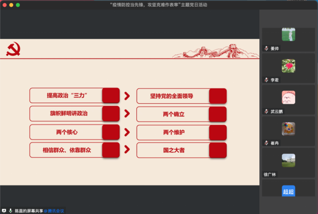 近日,外国语学院党总支在线上开展了“疫情防控当先锋,攻坚克难作表率”主题党日活动,进一步提高全体党员教师政治站位,强化风险意识,推动党史学习教育常态化长效化。
