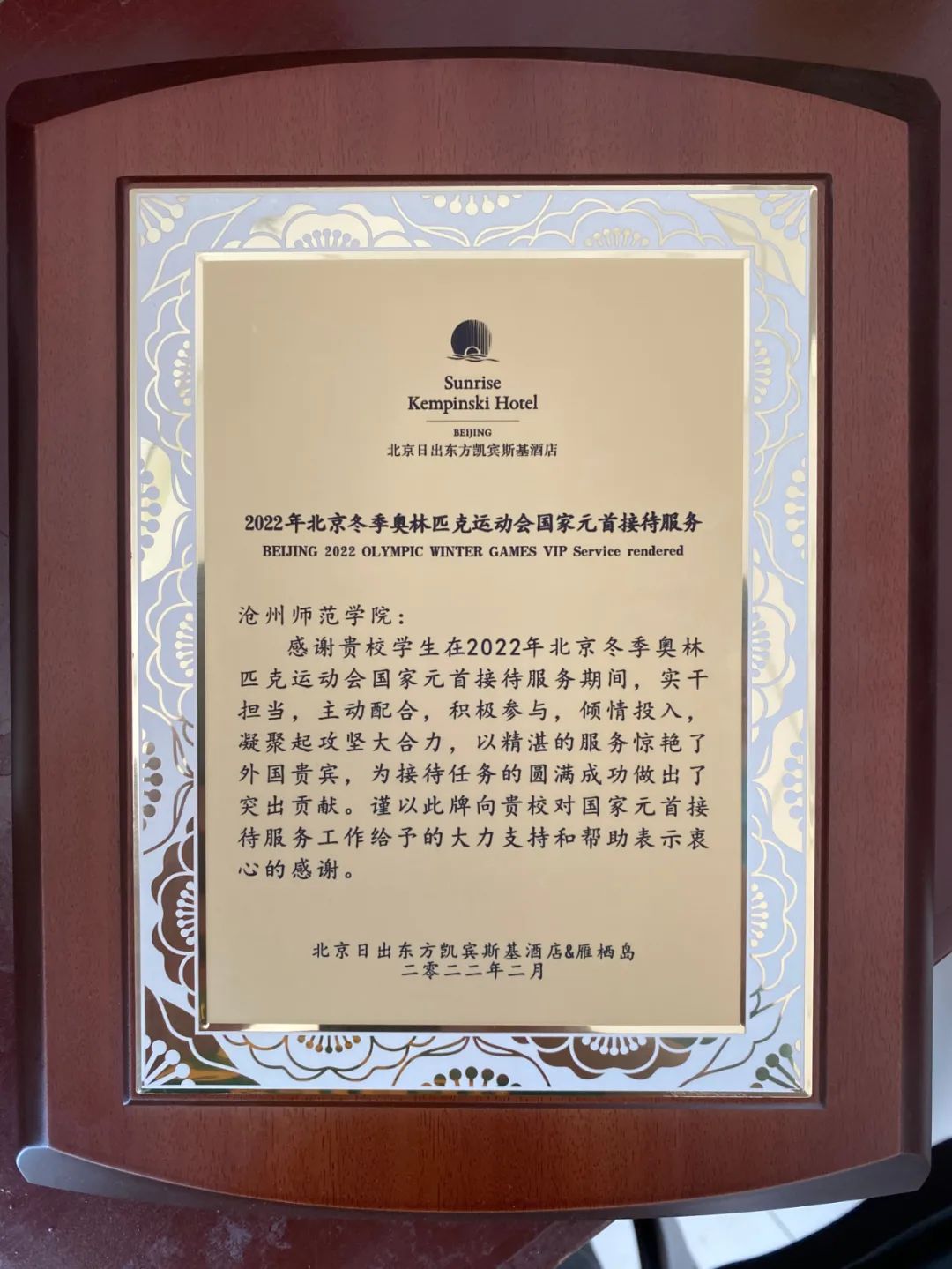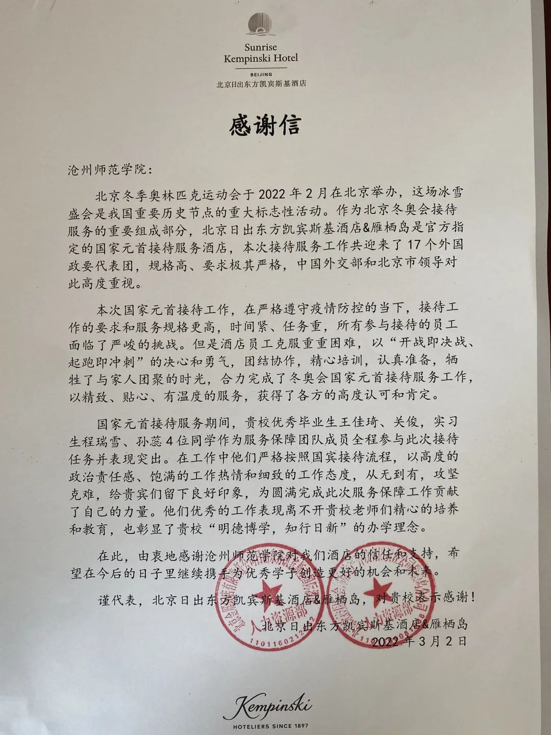 北京冬季奥林匹克运动会于2022年2月在北京举办,这场冰雪盛会是我国重要历史节点的重大标志性活动。北京日出东方凯宾斯基酒店&雁栖岛作为官方指定承担接待国家元首任务的酒店,对伟德4名学生在冬奥会接待工作中的优异表现给予高度评价,并于日前向伟德发来感谢信。