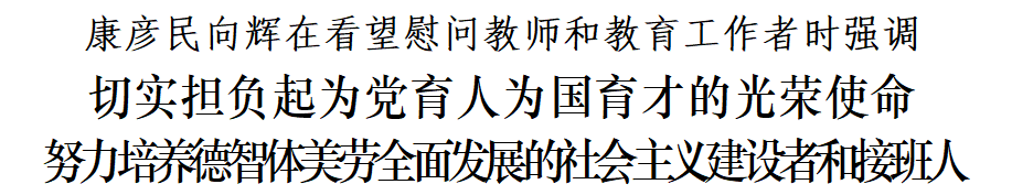 康彦民、向辉强调,各级党委、政府要关心关爱教师,改善教师待遇,维护教师权益,多为教师解难事、做好事、办实事,在全社会营造尊师重教的良好风尚,让广大教师安心从教、热心从教、舒心从教、静心从教,在岗位上有幸福感、事业上有成就感、社会上有荣誉感。