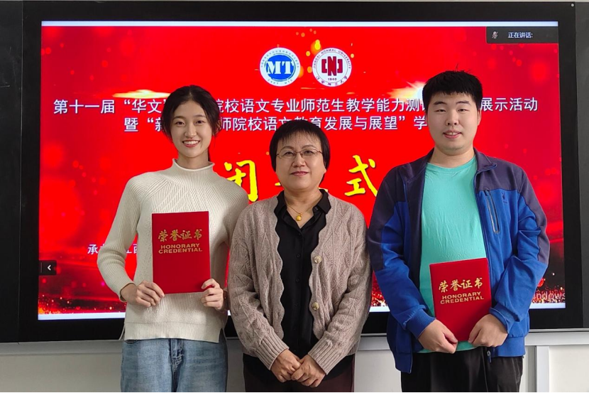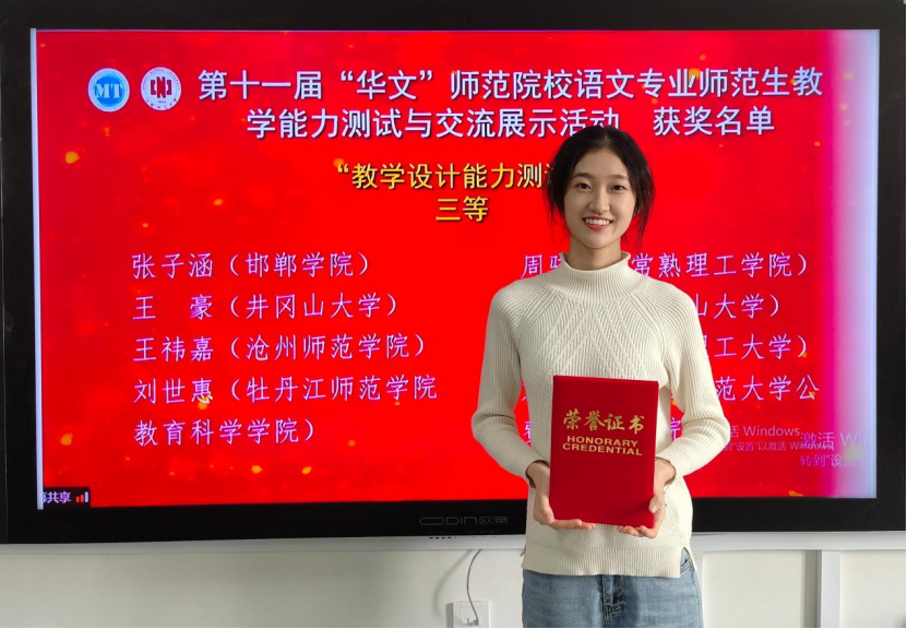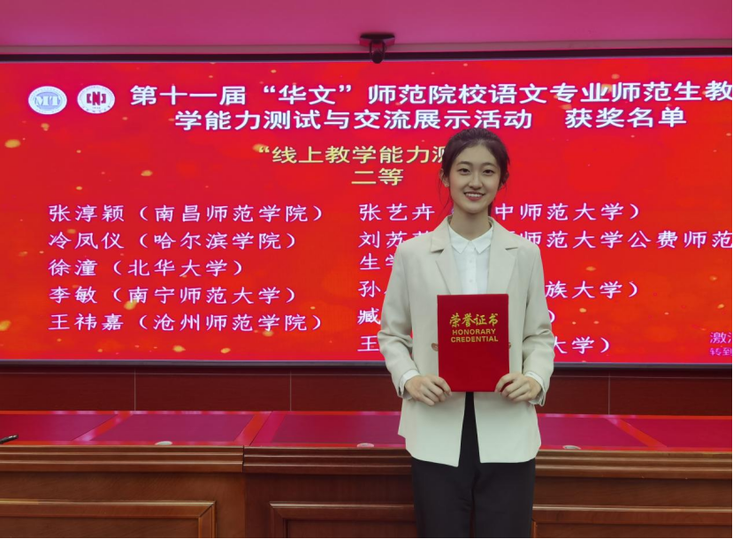 特别感谢王欣艳老师,何其有幸,能够成为她的学生!与其说她是指导老师,不如说是人生导师,是王老师给了我站上“华文”赛道的勇气,是王老师那温柔而有力量,如春风化雨的教诲,滋润着我的心田。那段时间恰逢师范认证,王老师每天于百忙之中抽出时间来耐心指导我们,孜孜不倦。老师,您辛苦了!我们赛中的优异表现,离不开您一直以来的辛勤付出、耐心指导、无微不至的关心与催人奋进的鼓舞,感谢所有老师及时雨般的赛前指导,感谢并肩作战的嘉豪同学,以及在背后热情支持我们的同学们。