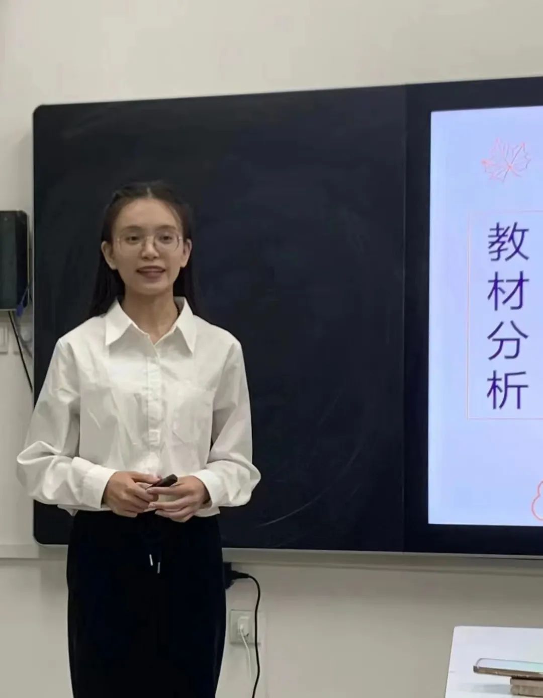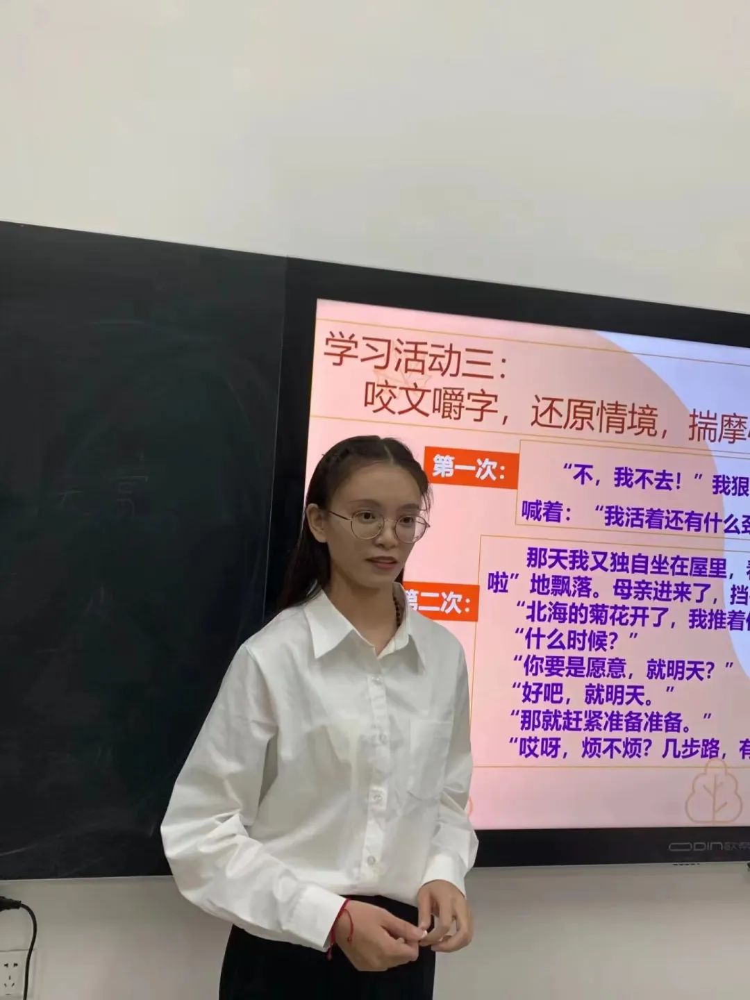 其次,是“钻研”。《秋天的怀念》这篇课文的教学设计与课件设计共经历了5次修改,甚至可以说是从头到尾的颠覆性修改,每一个教学环节的设计都围绕新课标开展,每一个答案和问题的预设用词都要经过仔细地揣摩。从三维教学目标的确定,到四环节教学活动的开展,每一个环节的步骤的衔接都紧紧贴合着学生的身心发展特点。课件的制作过程中每一个插图,每一个字的字体大小和颜色,每一个点缀的枫叶都经过了反复的尝试和修改,才有了最后的视觉效果。我也明白了未来想要当一名合格的语文老师,就一定要去了解学生,研究教材,学会教学。只有认真钻研才有机会成功。