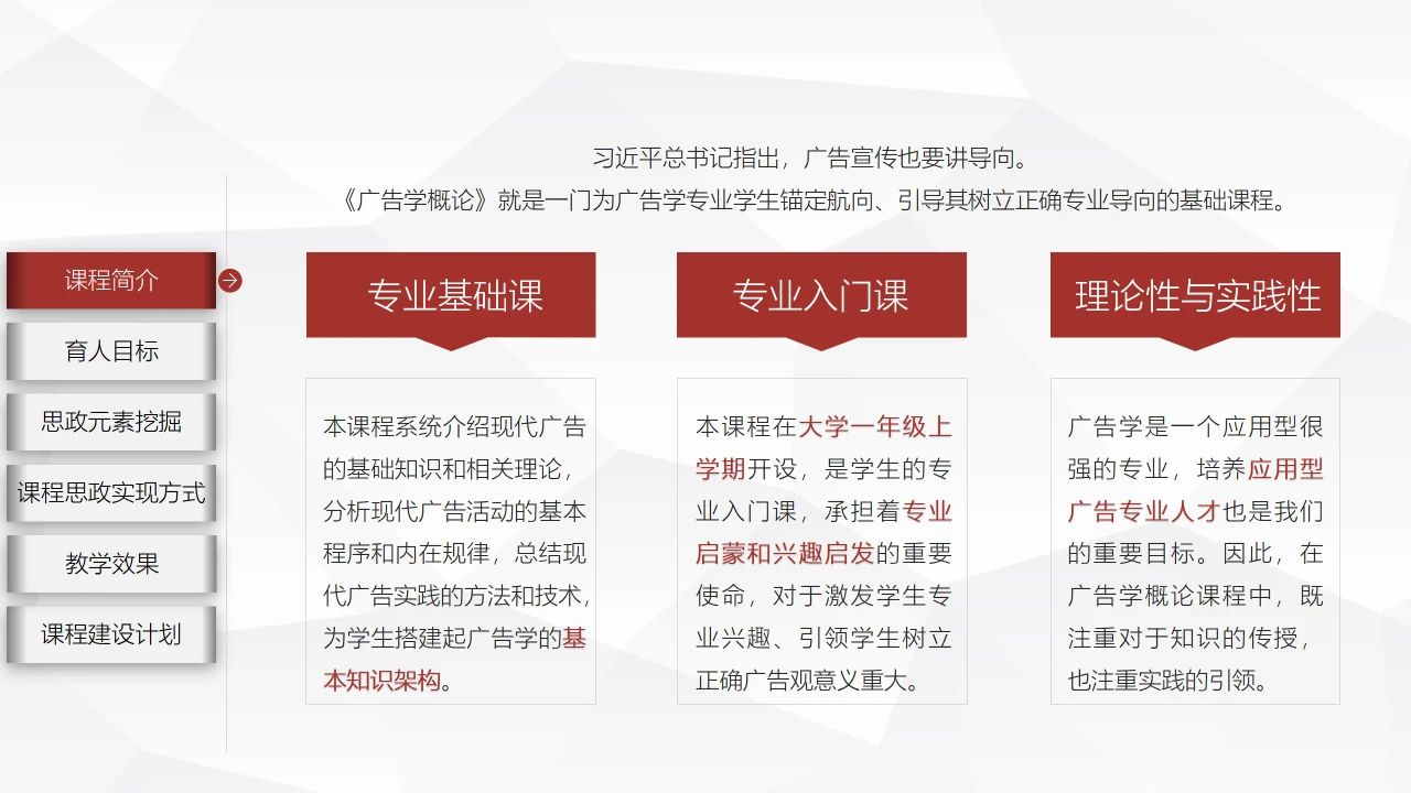 2022年上半年,伟德开展了伟德源自英国始于1946第二批课程思政示范课程申报工作。经各二级学院推荐、校内外专家严格评审,最终评选出第二批课程思政示范课程40门,课程思政建设课程12门。为及时总结经验,发掘典型做法,持续深入抓示范、树标杆,推动形成全面覆盖、类型丰富、层次递进、相互支撑的课程思政内容体系、教学体系、专业体系、培养体系、研究体系和评价体系,进一步巩固课程思政建设成果,方便老师们学习、交流,现将第二批课程思政示范课程说课课件分期进行刊发。