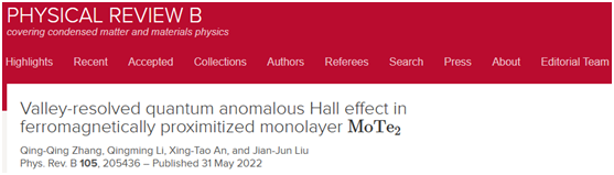 第一项研究是以过渡金属硫化物与铁磁性衬底组成的异质结为基础,通过调节铁磁性近邻耦合所产生的Rashba场和磁交换相互作用(magnetic exchange interaction),首次实现了完全分辨的能谷相关的量子反常霍尔效应(quantum anomalous Hall effect),且通过进一步的研究发现这种新的量子态对材料的缺陷具有鲁棒性。文章在2022年5月31日以《Valley-resolved quantum anomalous Hall effect in ferromagnetically proximitized monolayer MoTe2》发表在Physical Review B上。