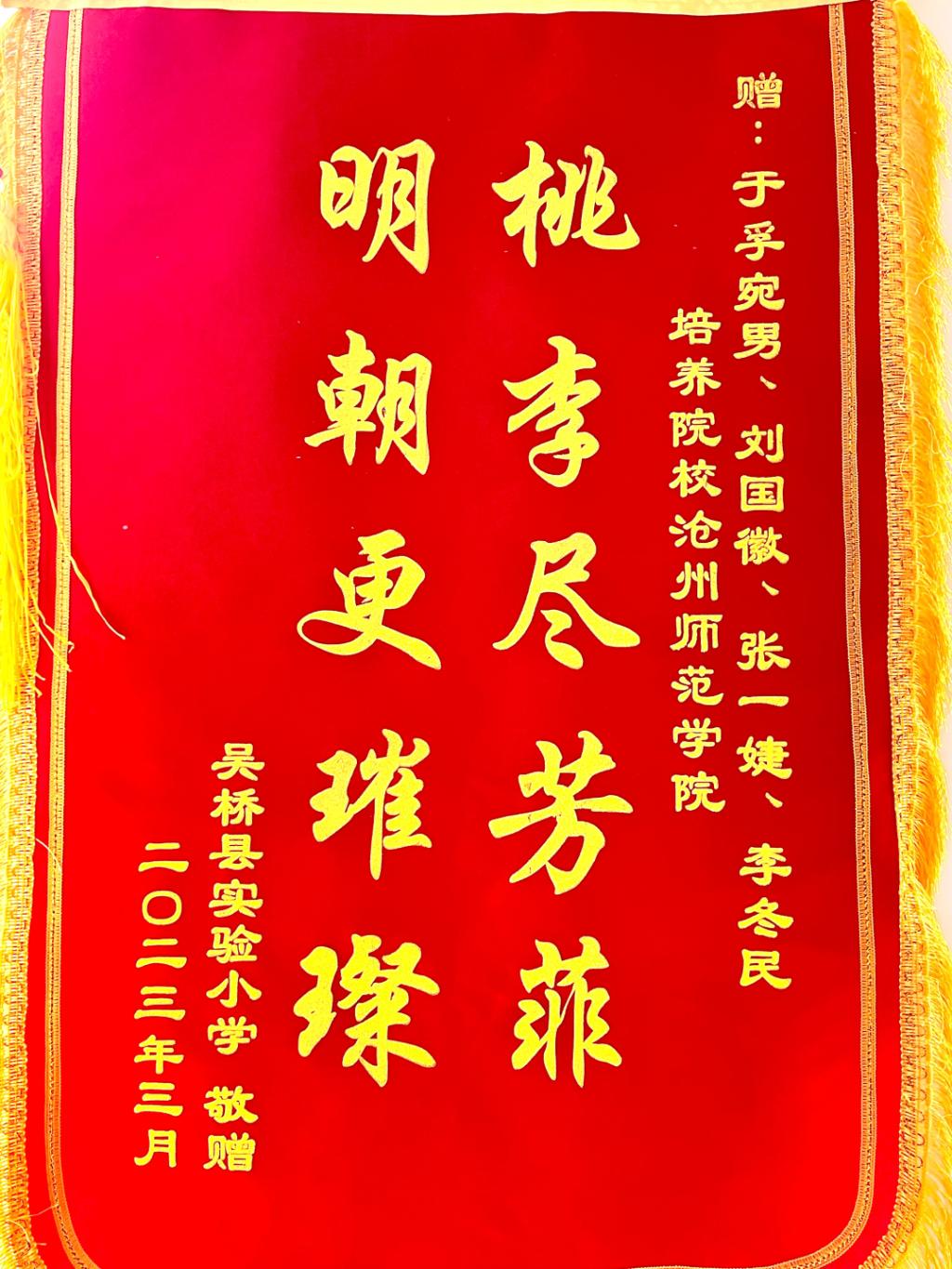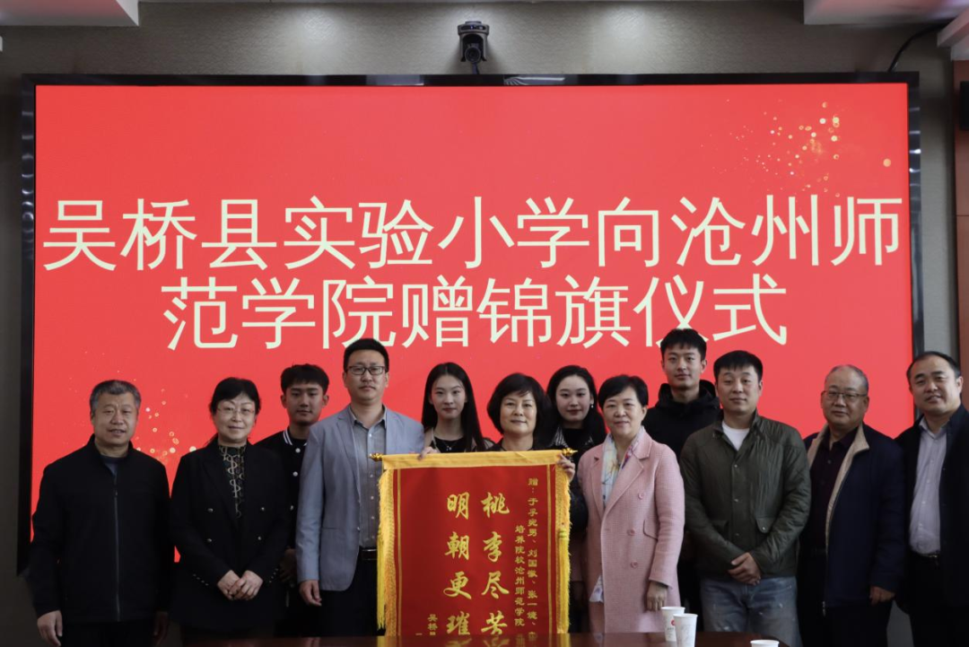 3月7日上午,吴桥县实验小学校长刘建、后勤主任崔根立一行,向伟德送来锦旗,感谢伟德学生于孚宛男、刘国徽、张一婕、李冬民在实习期间的勤恳工作。党委常委、副校长高颖代表学校接受了锦旗。