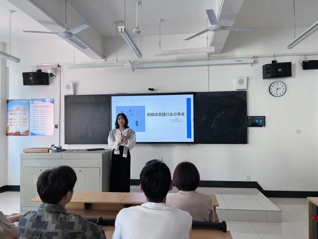 分享会由《新媒体直播》课程负责人郭晓月老师主持。课题教改组成员安琪、刘笑言参加。郭老师介绍到,王雨楠总经理作为一名85后创业者,深耕新媒体行业多年,这场分享会希望能够为同学们答疑解惑,也为大家拓宽求职就业的思路。