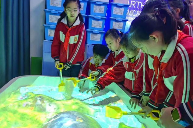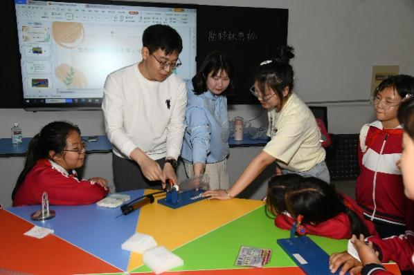 在物理与信息工程学院,该院院长郭玉秀接待了育红小学师生一行。该院教师金冶纯通过天体穹顶投影、体感互动地理沙盘、机器小车、范德格拉夫起电机等设备,让小学生们“深入”太空近距离观看星辰运动,亲手“改变”地质构造,用自己敲出的代码控制小车,体验静电的力量。随后,教师刘业堃带领小学生们来到饱和水汽膨胀液化实验与斯特林热机实验的小课堂,从实验原理、实验装置、实验过程、注意事项、实验现象、实验结论六个方面对两项试验进行讲解。