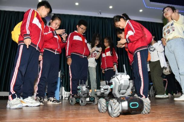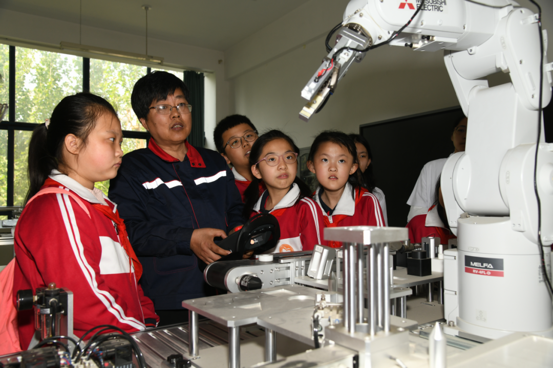 在机械与电气工程学院,马增强和周建起两位老师向小学生们演示了电梯模型制作过程。小学生们通过可视化的屏幕对设备进行操作,引导电梯在轨道上运动。