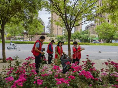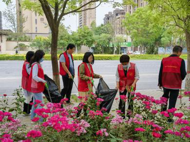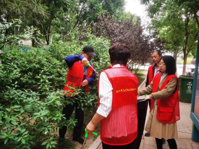 党员干部们手持工具,认真开展卫生清洁,同时向居民、路人等宣传环保知识和创城精神。