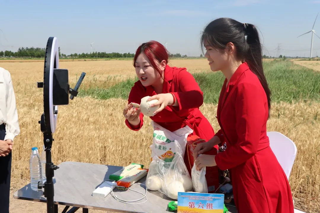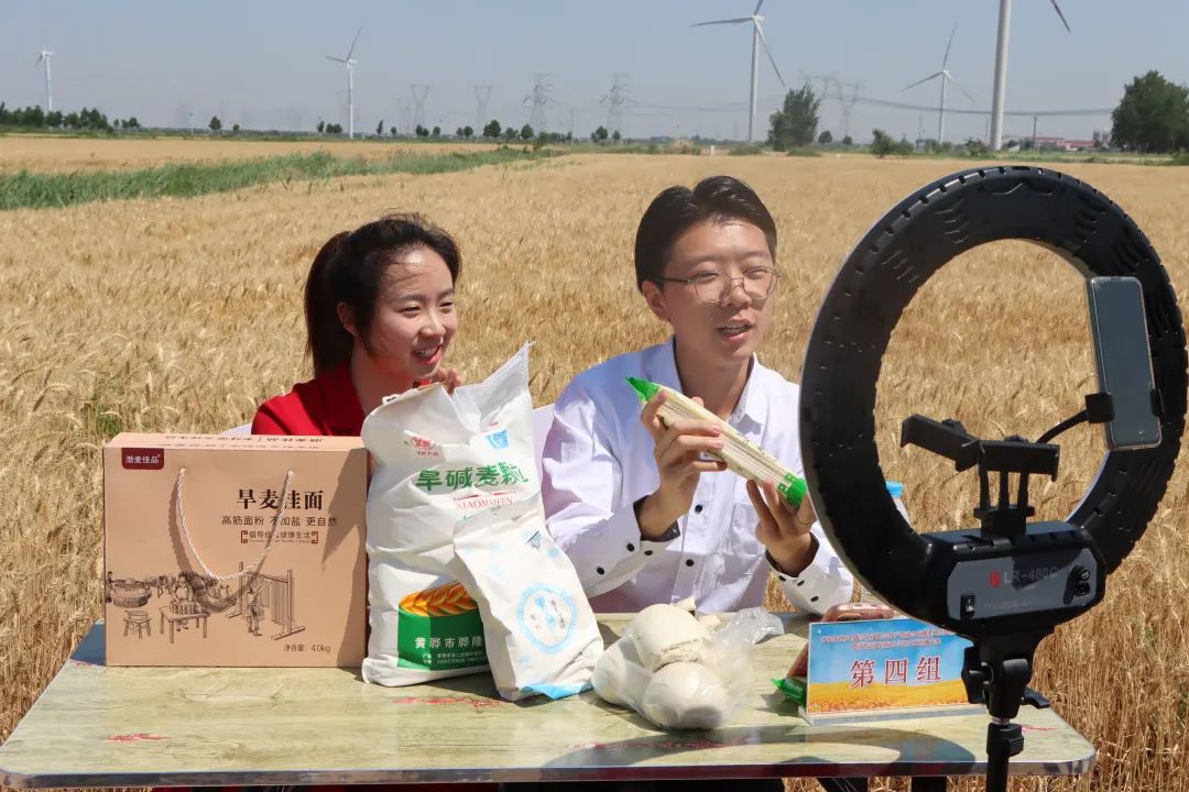 在屈国治宣布齐家务镇乡村振兴党建联合体直播基地成立,云电军宣布齐传添翼首届大学生农商直播大赛正式开始后,伟德“齐传天翼”大学生直播团队、传媒集团、农产品公司组成的6组直播团队,深入田间地头,对旱碱麦面粉、面条、面花等特色农产品现场直播带货,同台打擂,共助旱碱麦农产品销量提升。