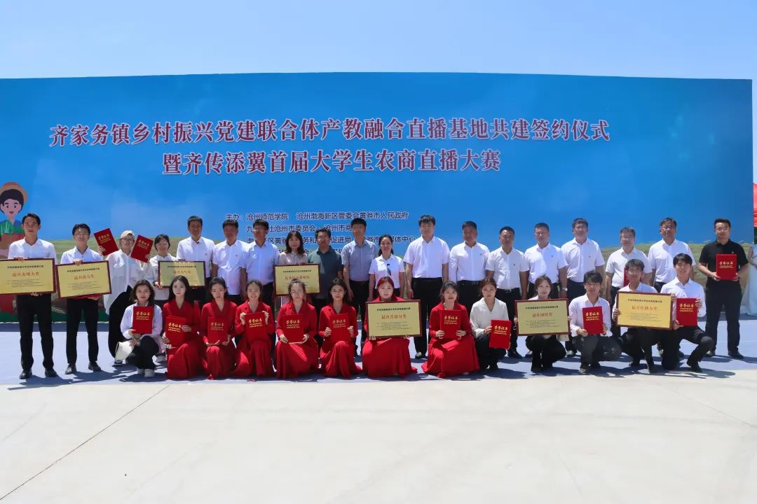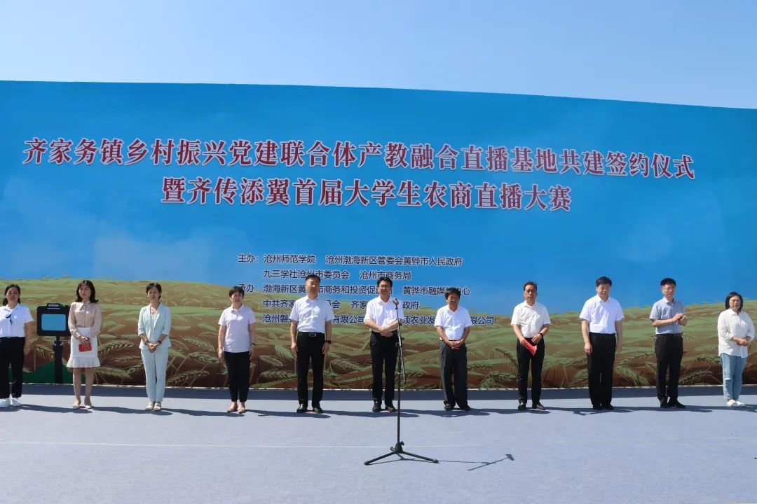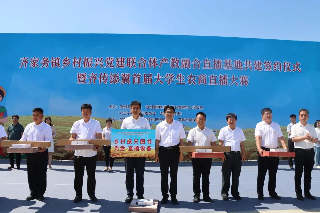 校党委书记云电军,沧州渤海新区党工委、黄骅市委副书记屈国治为“齐家务镇乡村振兴党建联合体直播基地”“齐传添翼大学生农商直播实践基地”揭牌。