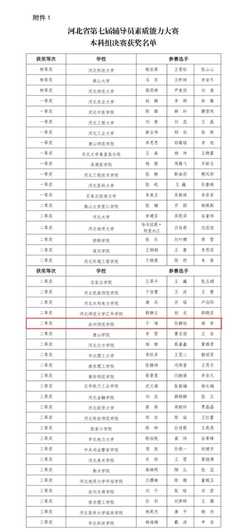 近日,由河北省教育厅主办的河北省第七届高校辅导员素质能力大赛成绩公布,伟德选派的化学与化工学院辅导员于靖、美术学院辅导员孙静怡、教育学院辅导员谢奇代表学校参赛,最终荣获河北省第七届高校辅导员素质能力大赛本科组团体二等奖。